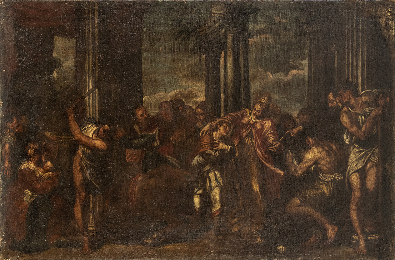 Il dipinto replica fedelmente la tela di Paolo Farinati dipinta per il presbiterio della Chiesa Veronese dei Santi Nazario e Celso, della cui decorazione pittorica, comprensiva di grandiosi dipinti ed affreschi, l'artista fu interamente responsabile. Questa interessante redazione di bottega restituisce la monumentalità, il dinamismo, l'accuratezza nella definizione delle anatomie e l'attenzione alle architetture che, sotto il segno di Paolo Veronese, costituiscono i tratti salienti della pittura di Farinati.