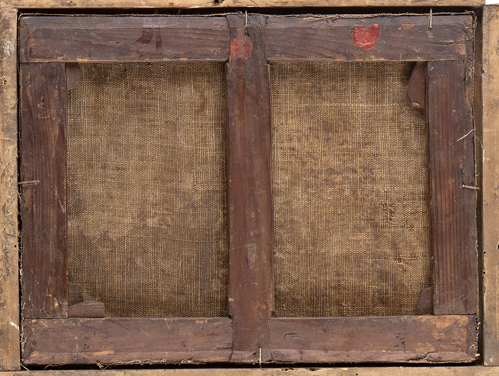 L'opera riporta al retro sul telaio due bolli in ceralacca non decifrabibili.
