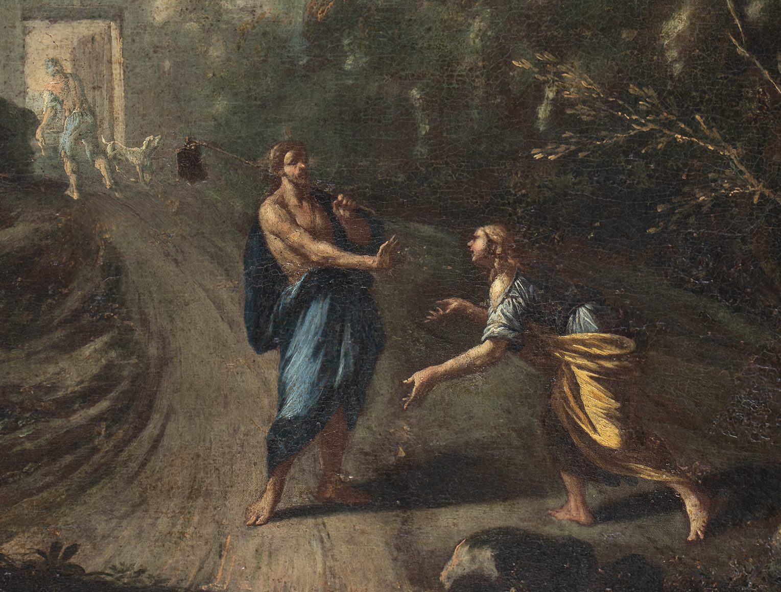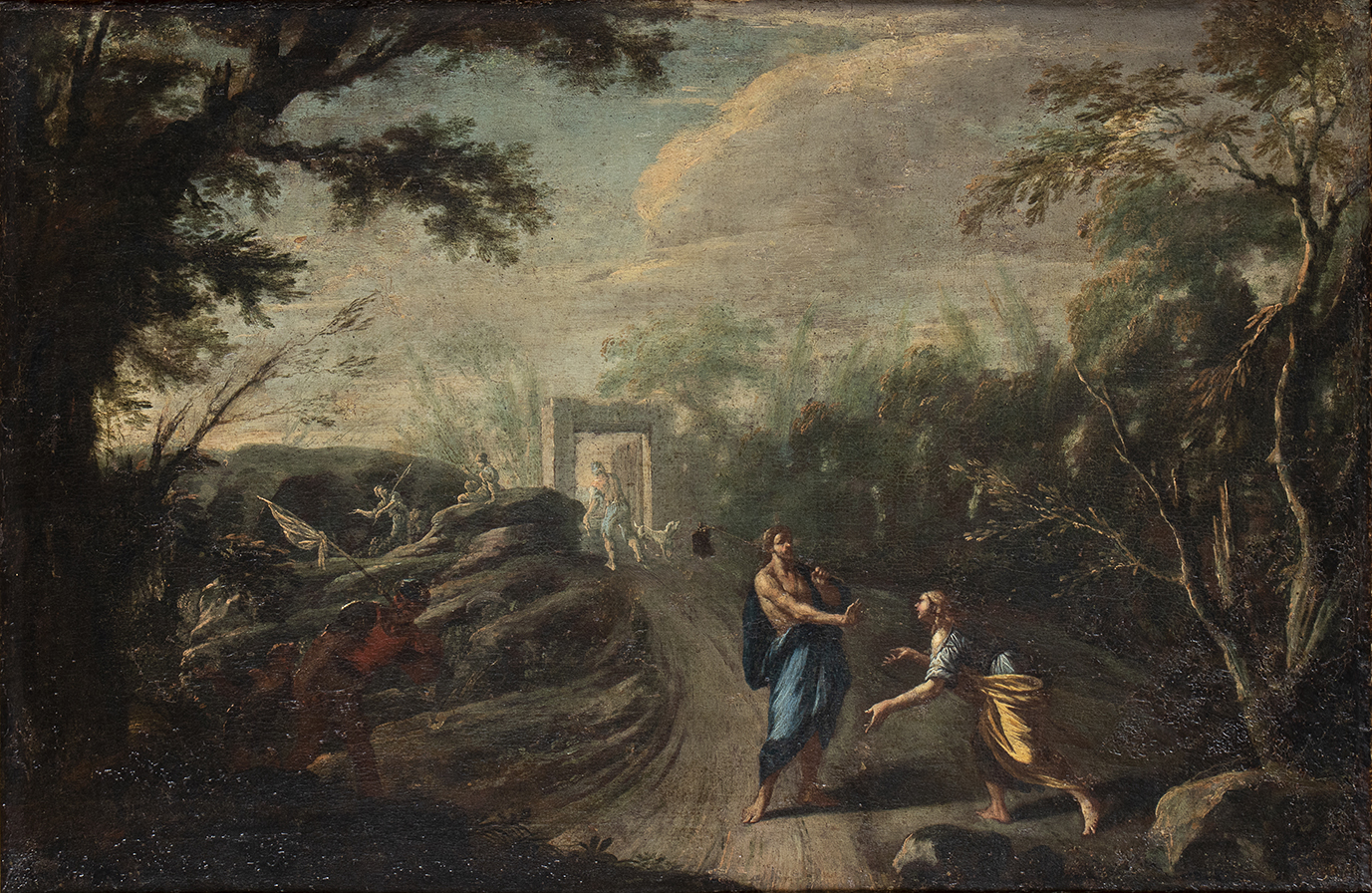 Questa tela di squisita fattura può essere ricondotta alla produzione di destinazione privata di Domenico Gargiulo, nella quale il tema sacro viene sovrastato dallo scenario naturale lasciando spazio alle brillanti qualità di paesaggista del pittore. Intorno al gruppo principale di Cristo e Maddalena la tela è punteggiata di figurette eseguite con tocco rapido e sintetico, tra cui spiccano quelle sullo sfondo, filamentose e trasparenti come ectoplasmi. Nei modi tipici di Micco si presentano sia le figurine dei due protagonisti, allungate e leggermente microcefale, nelle quali si può rinvenire l’influsso di Callot e Schoenfeld, sia la conduzione pittorica abbozzata e sfrangiata, sia, infine, le lievi ed esili foglioline dorate dalla luce del sole, presenti in tanti brani di paesaggio dei suoi dipinti: si pensi alla Predica del Battista (Villa Livia, Napoli) e alle due tele ottagone en pendant raffiguranti Agar e l’angelo e Loth e le figlie (Marano di Castenaso, Coll. Molinari Pradelli).