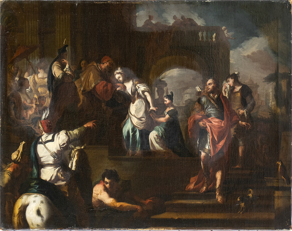 Molto meno diffuso nella pittura barocca italiana rispetto all’Incontro al pozzo tra Rebecca e il servo di Abramo Eleazer, il Congedo di Rebecca dai genitori ne rappresenta l’epilogo narrativo, precedendo la partenza della fanciulla allo scopo di sposare il patriarca rimasto vedovo della moglie Sara (Genesi 24, 59-61). Il nostro dipinto replica con qualche variante la bellissima e complessa composizione messa a punto da Solimena nella tela oggi custodita presso il Musée Fesch di Ajaccio.