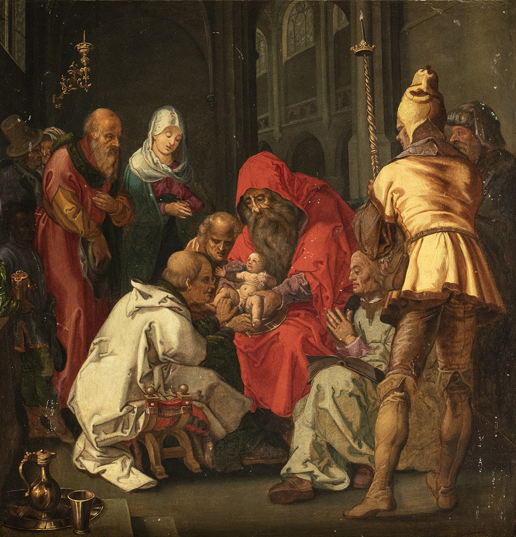 Questa tavola di elevata qualità deriva da una celebre incisione di Hendrick Goltzius, datata 1594, parte della serie della Vita della Vergine. Rispetto all'incisione possiamo rilevare nel nostro dipinto molteplici piccole varianti che lo qualificano come un originale traduzione pittorica coeva al prototipo.