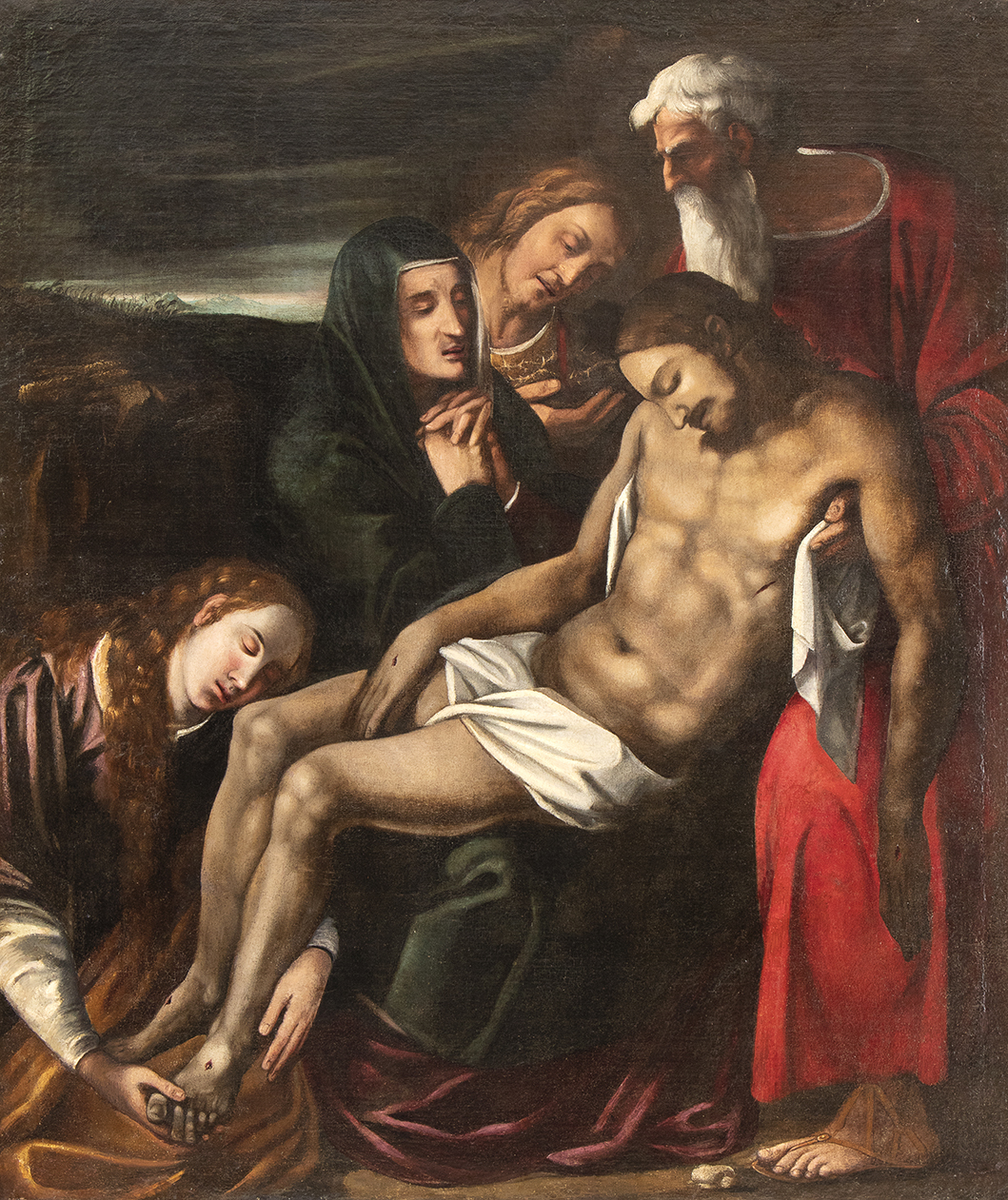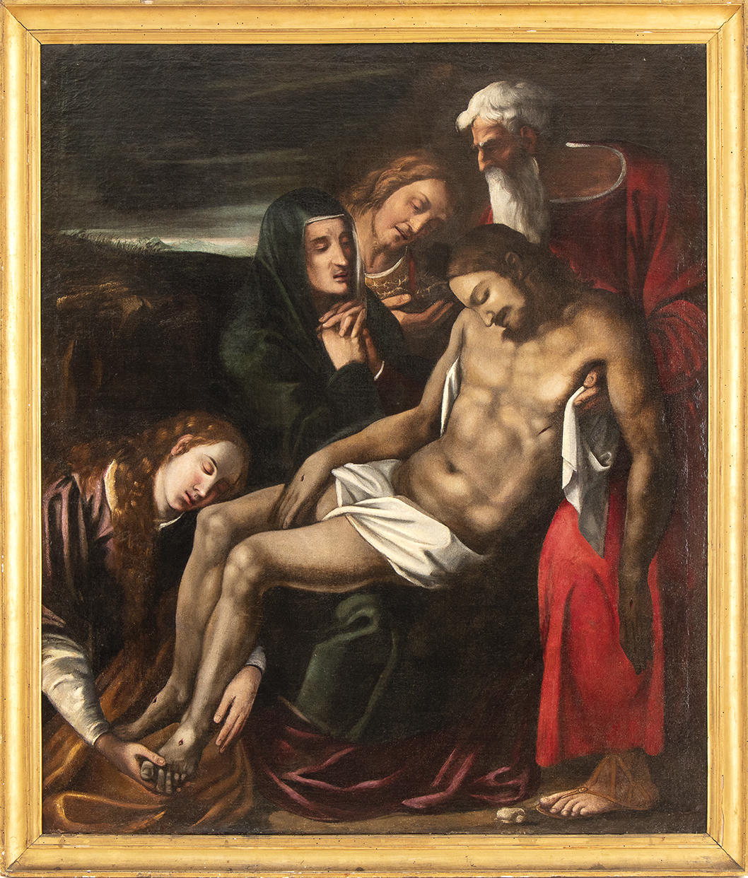 La tela è strettamente in relazione con la Pietà eseguita da Scipione Pulzone entro il 1593 per la Cappella della Passione della chiesa del Gesù in Roma e oggi presso il Metropolitan Museum di New York. Della grande tela d'altare, uno dei vertici del corpus pulzoniano, la tela qui in oggetto, con ogni probabilità decurtata ai lati, riprende con molte licenze il gruppo delle cinque figure principali.