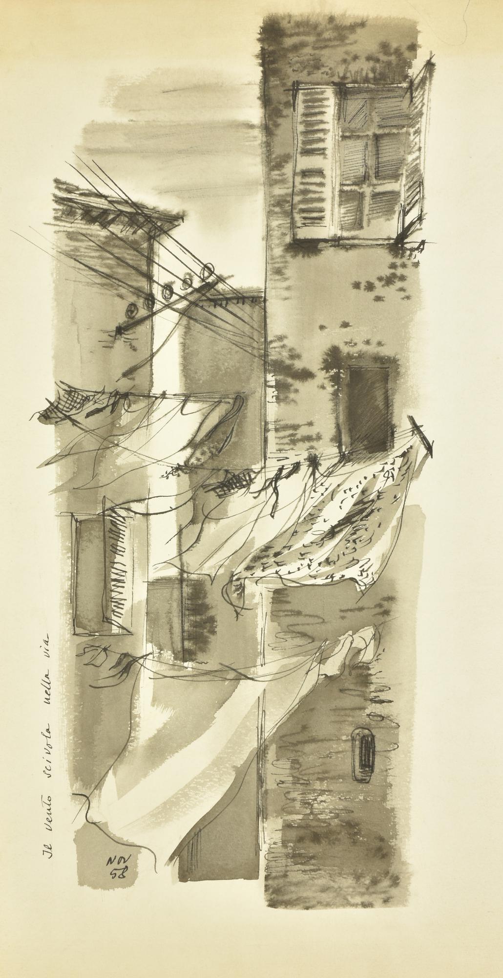 Ignoto IL VENTO SCIVOLA NELLA VIA tecnica mista su carta, cm 30x56 titolo e...