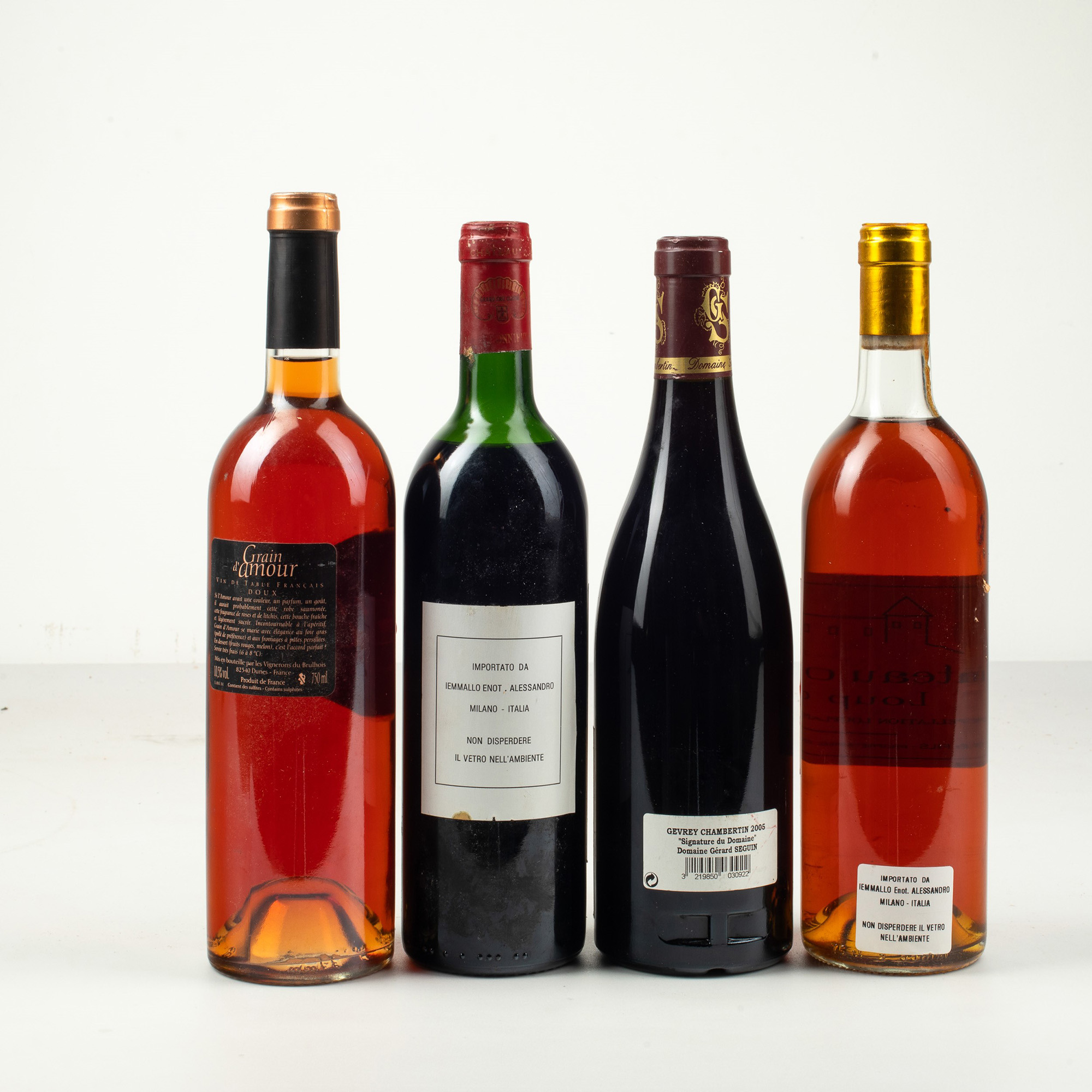 (4 Bts), Grain d'Amour, 1 Bt WN, Chateau Carbonnieux, 1988, 1 Bt S, Gerard Seguin, 2005, 1 Bt WN, Chateau du Cros, 1988, 1 Bt TS, etichette e capsule con segni d'usura del tempo