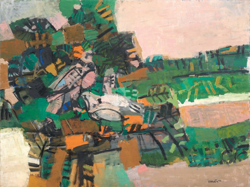 Antonio Scordia Santa Fè 1918 - Roma 1988 Paesaggio con i colombi, 1955 Olio su tela, cm. 97x130 Firma e data in basso a destra: Scordia 55; al verso sul telaio: etichetta VII Quadriennale Nazionale d'Arte di Roma / Roma 1955 / 1956, con dati dell'opera. Parere favorevole Archivio Antonio Scordia, Roma.