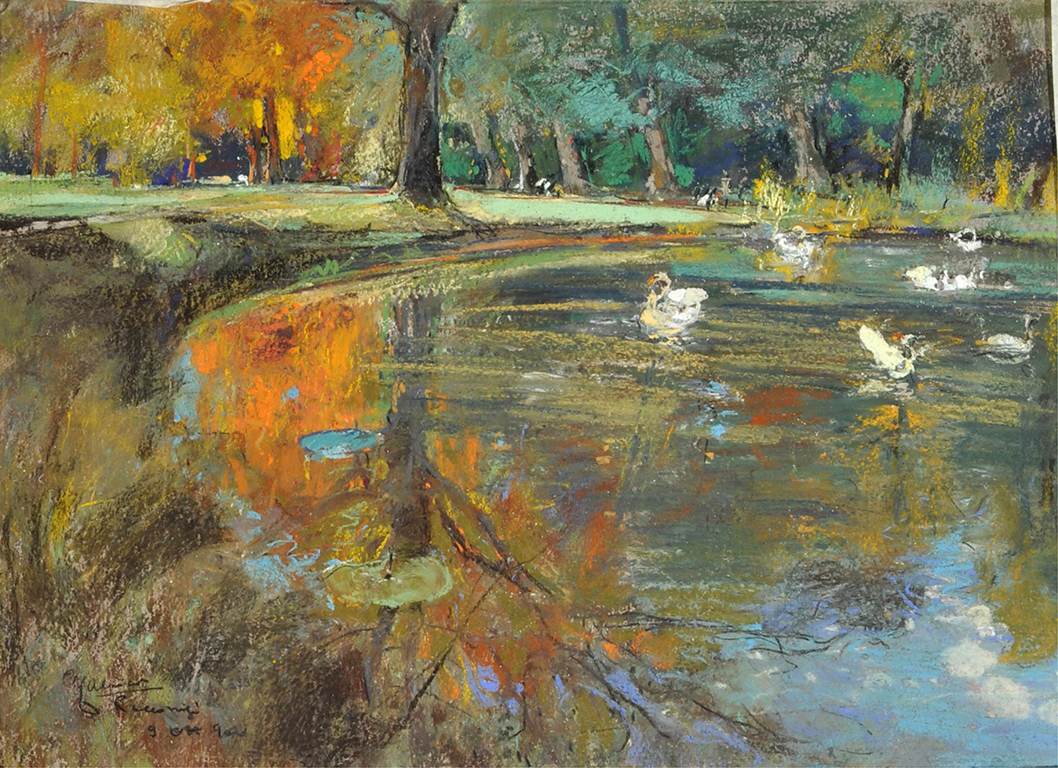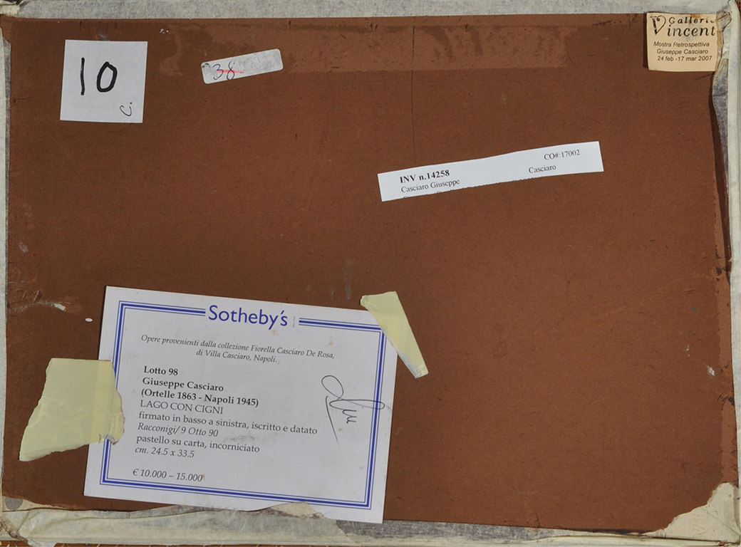 Casciaro Giuseppe (Ortelle, LE 1863 - Napoli 1941) Lago con cigni pastelli su carta, cm 24,5x33,5 firmato, datato e iscritto in basso a sinistra: G. Casciaro Racconigi 9 Ott. 90 a tergo timbro Giuseppe Casciaro, Napoli Provenienza: Coll. Fiorella Casciaro De Rosa, Napoli ; coll. privata, Napoli Esposizioni: Vincent 2007 Bibliografia: Giuseppe Casciaro, a cura di R. Caputo Ed. Vincent 2007 tav. 14 pag.40