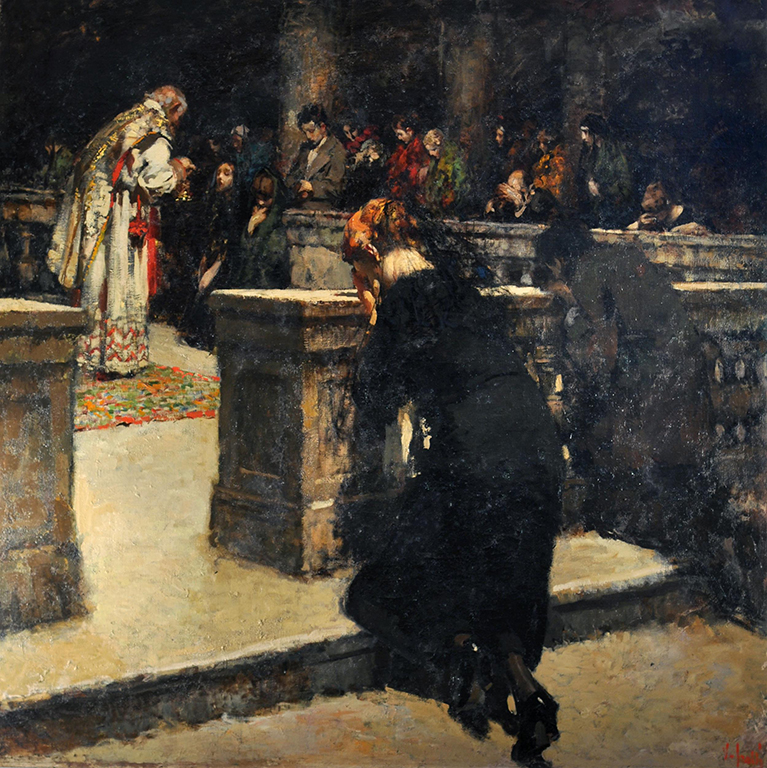 Irolli Vincenzo (Napoli 1860 - 1949) La comunione olio su tela, cm 200x200 firmato in basso a destra: V. Irolli Esposizioni: 1936 Mostra Arte Sacra Roma