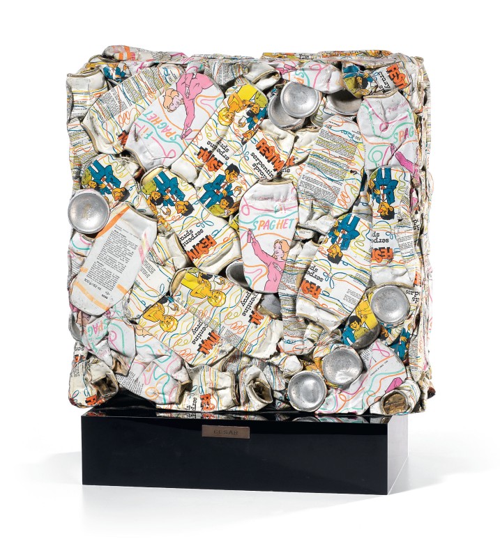 César Marsiglia 1921 - 1998 Compression Compressione di lattine, cm. 42x41x12,5 Firma in basso a destra: César. Foto autenticata dall'artista; certificato Foto Ferrero, Nizza,18 febbraio 1991. Esposizioni: Grandi maestri, piccole sculture, da Depero a Beverly Pepper, a cura di Lara Vinca Masini, Pistoia, Palazzo Sozzifanti, 6 aprile - 30 giugno 2013, cat. pp. 138, 139, illustrata a colori.