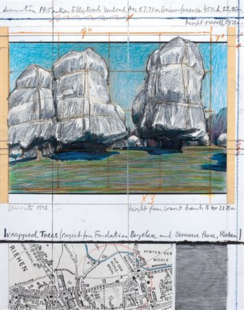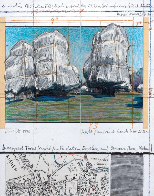 Christo Gabrovo 1935 Wrapped trees, 1998 Tecnica mista su carta applicata su tavola, cm. 35,5x27,7 Firma e data sul lato sinistro: Christo 1998; titolo in basso: Wrapped Trees (Project for Fondation Beyeler an Berower Park, Riehen); firma e data al verso sulla tavola: © Christo 1998. Esposizioni: Grandi maestri, piccole sculture, da Depero a Beverly Pepper, a cura di Lara Vinca Masini, Pistoia, Palazzo Sozzifanti, 6 aprile - 30 giugno 2013, cat. p. 136, 137, illustrata a colori. Opera acquistata direttamente dall'artista.
