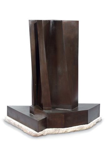 Giò Pomodoro Orciano (PU) 1930 - Milano 2002 Senza titolo, (1970 ca.) Scultura in bronzo a patina verde e bruna, con zoccolo in marmo, es. 1/3, cm. 140 h. (bronzo) Marchio dell'artista e tiratura sulla base: GP / 1/3. Storia: Collezione privata, Monaco; Collezione privata