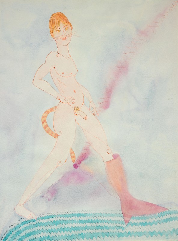Luigi Ontani Vergato (Bo) 1943 Fofò non ha fifa, 1985 China e acquerello su carta, cm. 102x76 Titolo, data firma al verso: «Fofò non ha fifa» / 85 / L. Ontani: su una carta di supporto: timbro Scognamiglio & Teano / Agenzia d'Arte Moderna / Napoli. Foto autenticata dall'artista, con n. A1132, n. 475.