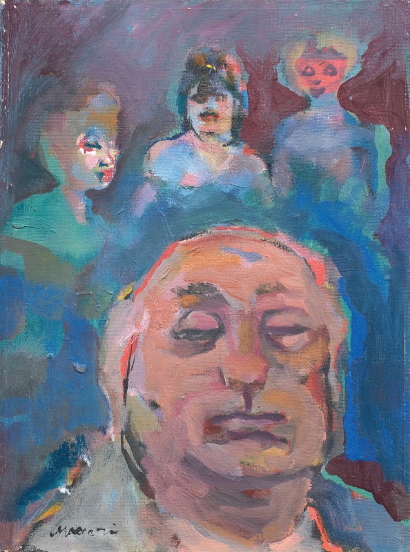 Mino Maccari Siena 1898 - Roma 1989 Figure Olio su cartone telato, cm....