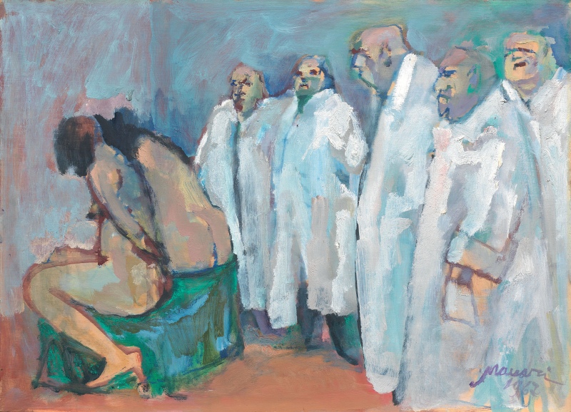 Mino Maccari Siena 1898 - Roma 1989 Figure, 1967 Olio su tavola, cm. 50x70...