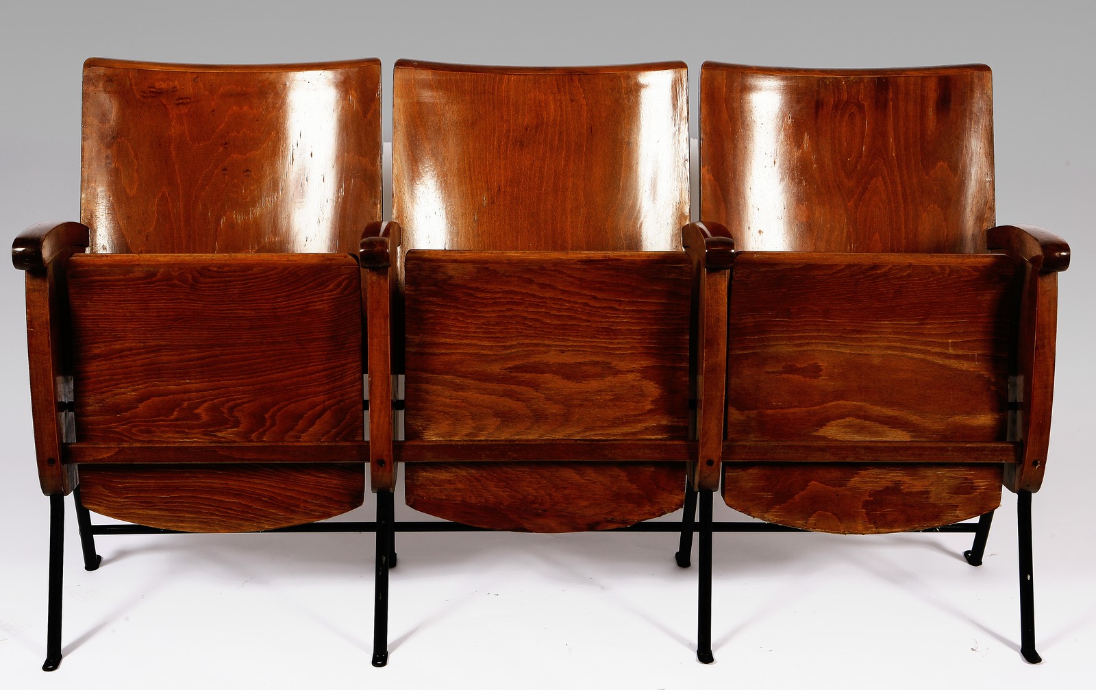 Fila di tre poltroncine a sedili ribaltabili da cinema. Row of three seats with folding seats.Wood and painted metal. Legno e metallo verniciato. Cm 190x80x50. 1940.