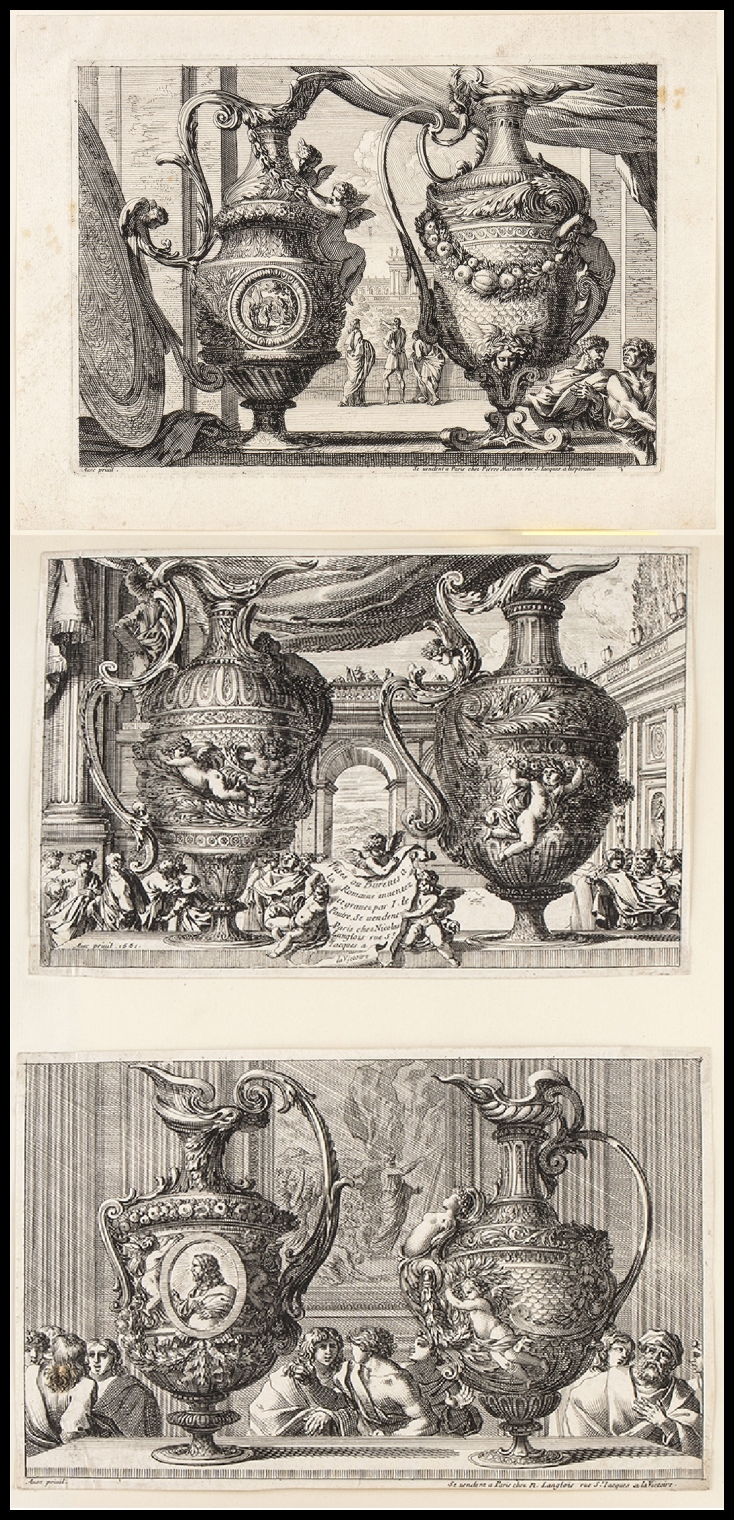 frontespizio, stato III su V; due vasi di profilo di cui uno decorato con un medaglione con Cristo stato III su IV (pubblicate a Parigi da Nicolas Langlois nel 1661); due burette, stato I su IV, pubblicata da Pierre II Mariette (1634-1716), IFF.1980/1981/1985