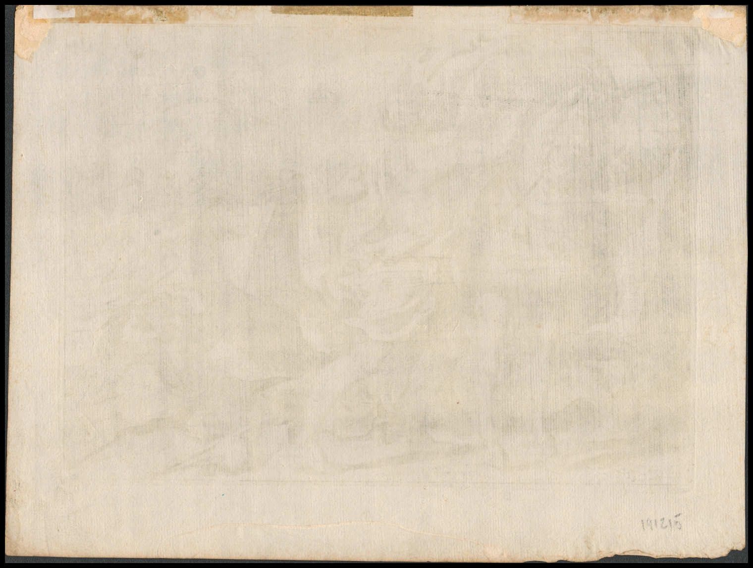 Rarissima prova di un incisore conosciuto solo da poche stampe (MET, Rijksmuseum). Impressione nitida e ben inchiostrata su carta vergellata con filigrana. Ottime condizioni tranne macchie di scotch sul bordo superiore e residui di carta sul retro agli angoli superiori.