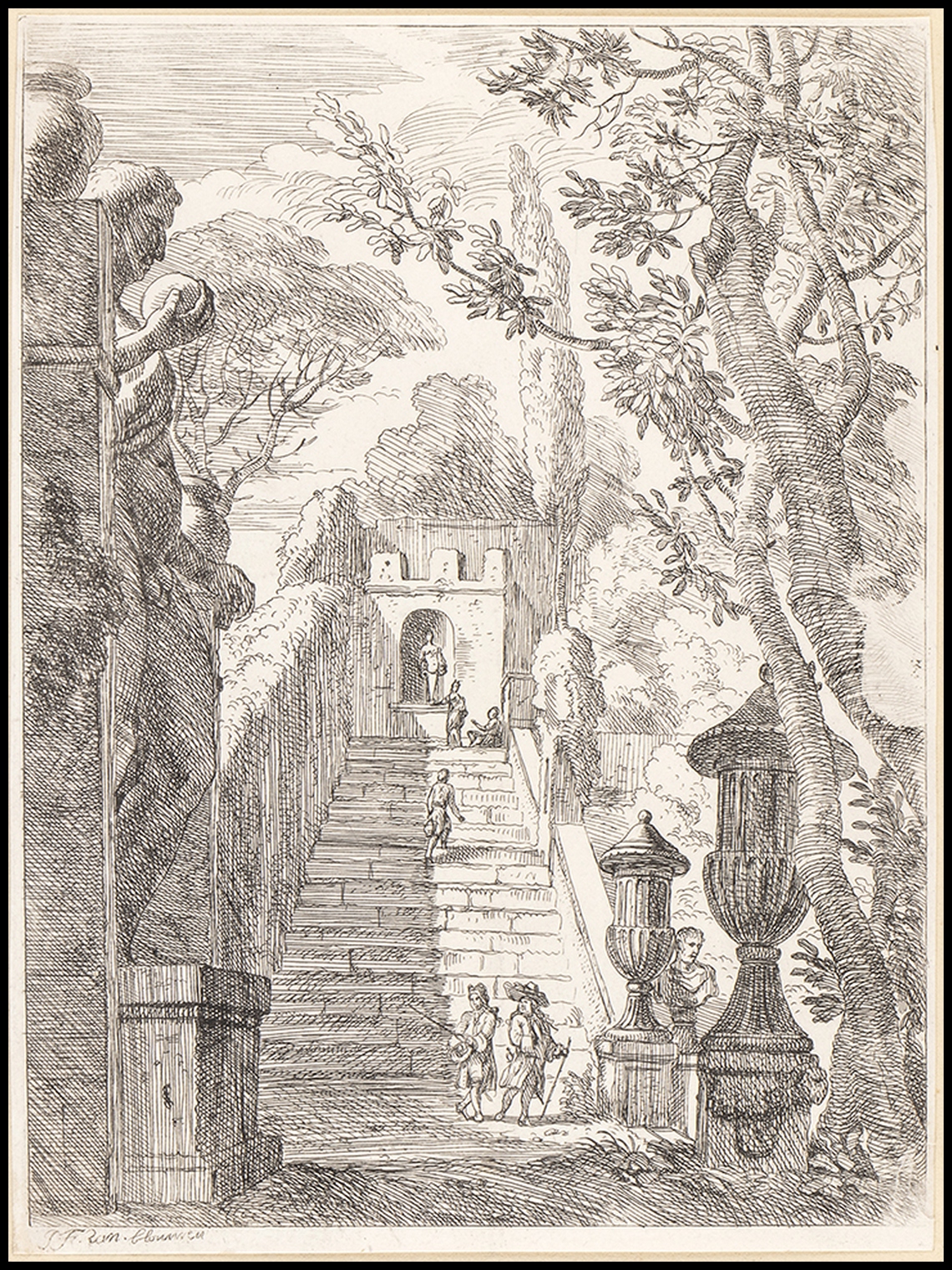 Esemplari rifilati, applicati per quattro punti al foglio di carta. Buono stato di conservazione. 'Veduta con la scalinata' presenta un strappo in basso alla destra.