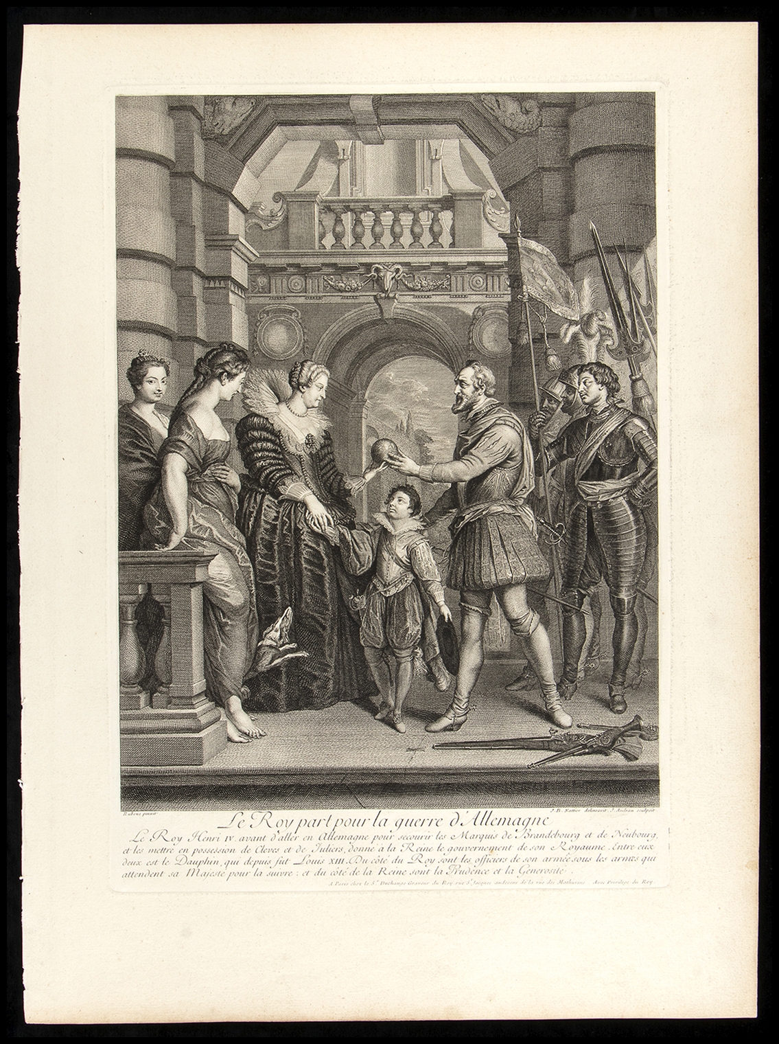 Dalla serie di 24 incisioni realizzate da diversi incisori su disegno di Nattier, dagli affreschi di Rubens raffiguranti vita Marie de' Medici che l'artista dipinse intorno al 1622-1623.