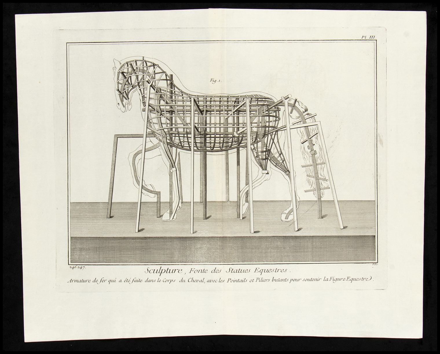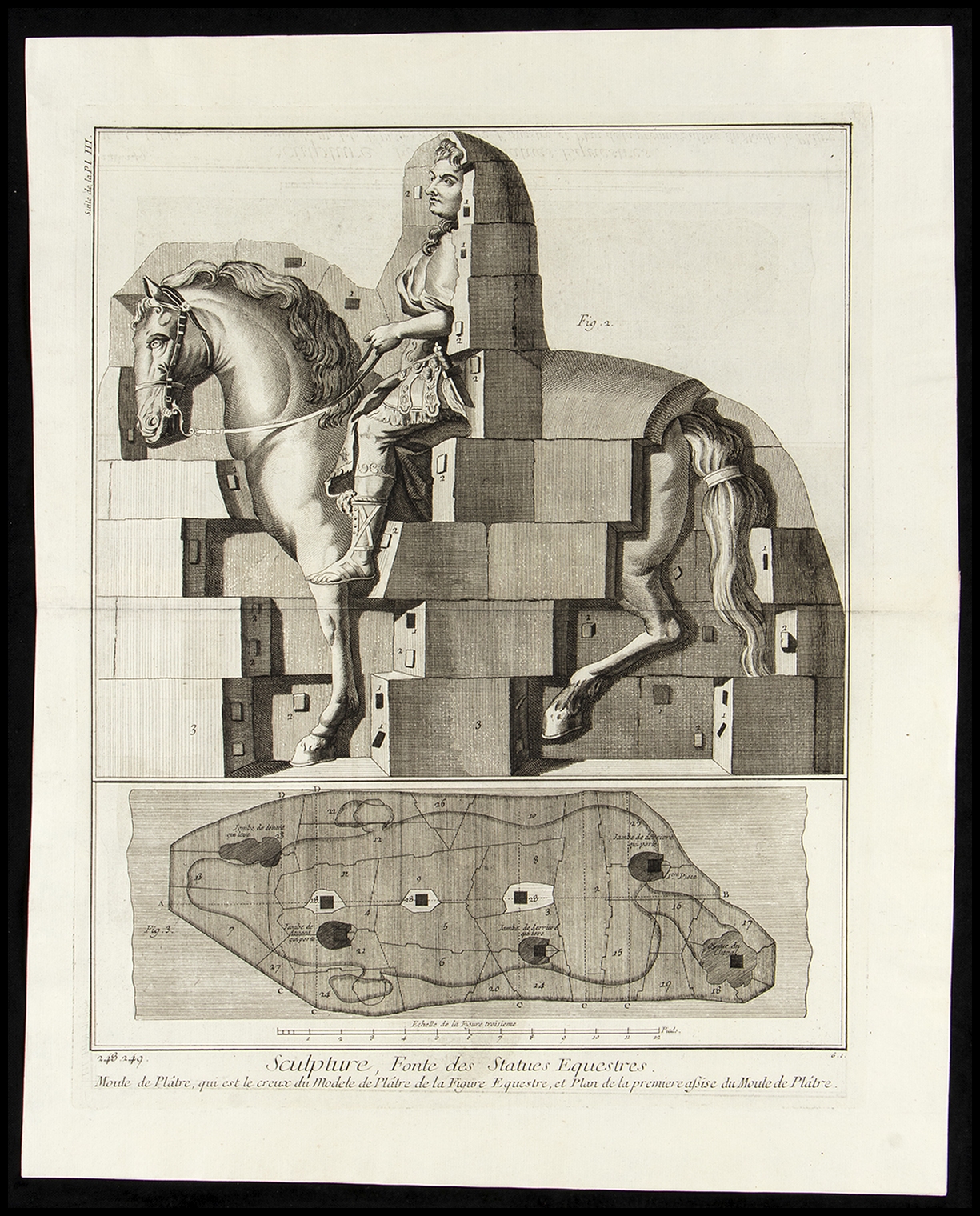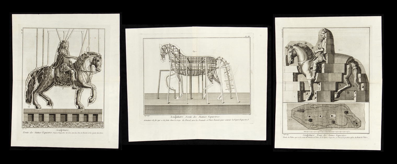 Lotto di tre tavole tratte da "Description de ce qui a été pratiqué pour fondre en bronze d'un seul jet la figure equestre de Louis XIV", pubblicata a Parigi nel 1743.