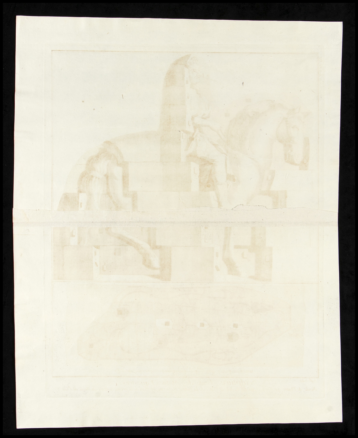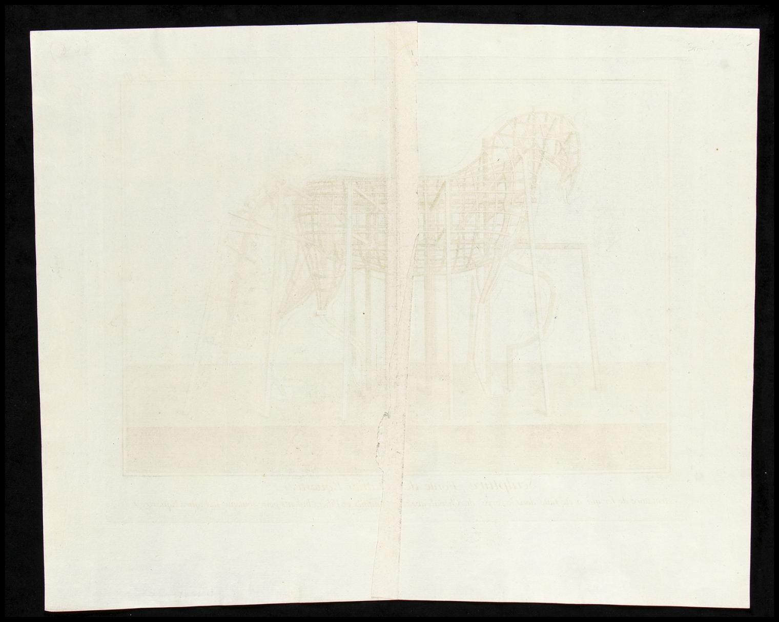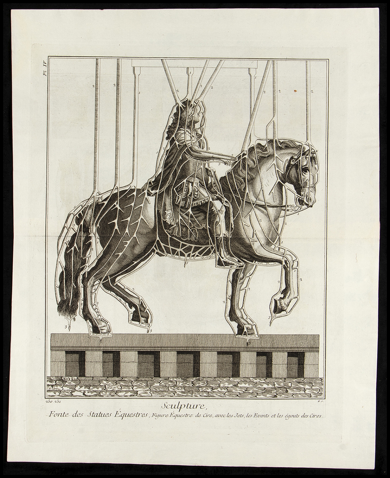 Lotto di tre tavole tratte da "Description de ce qui a été pratiqué pour fondre en bronze d'un seul jet la figure equestre de Louis XIV", pubblicata a Parigi nel 1743.