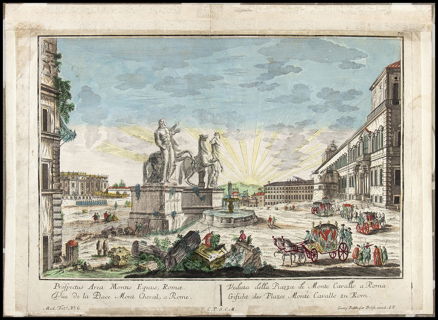 1) Georg Balthasar Probst (1732-1801) Prospectus Area Montis Equus, Romae. Acquaforte, 31,1 x 44,8 cm. Veduta ottica raffigurante il Quirinale a Roma. Esemplare con margini ricostruiti. Coloritura coeva. Segni di colla sui margini, qualche macchia e increspatura. Posato su cartonicino moderno.