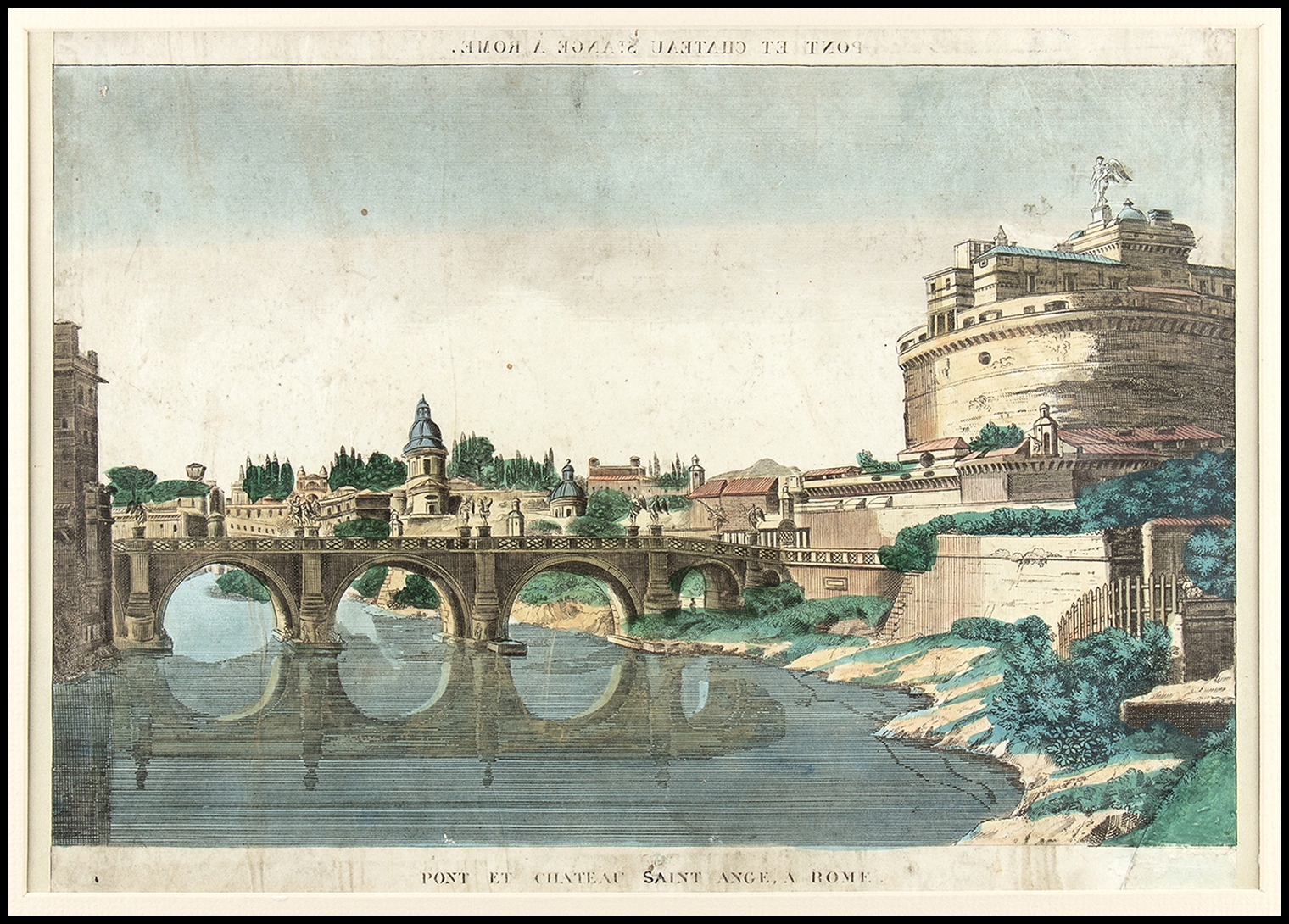 28,5 x 38,4 cm. Veduta ottica raffigurante il ponte e Castel Sant'Angelo a Roma. Esemplare con coloritura coeva, con i margini destro e a sinistro reconstruiti. Mancanza all'angolo in basso a destra, riparato. Incollato tra due cartoncini di passepartout moderno. Modesto stato di conservazione.