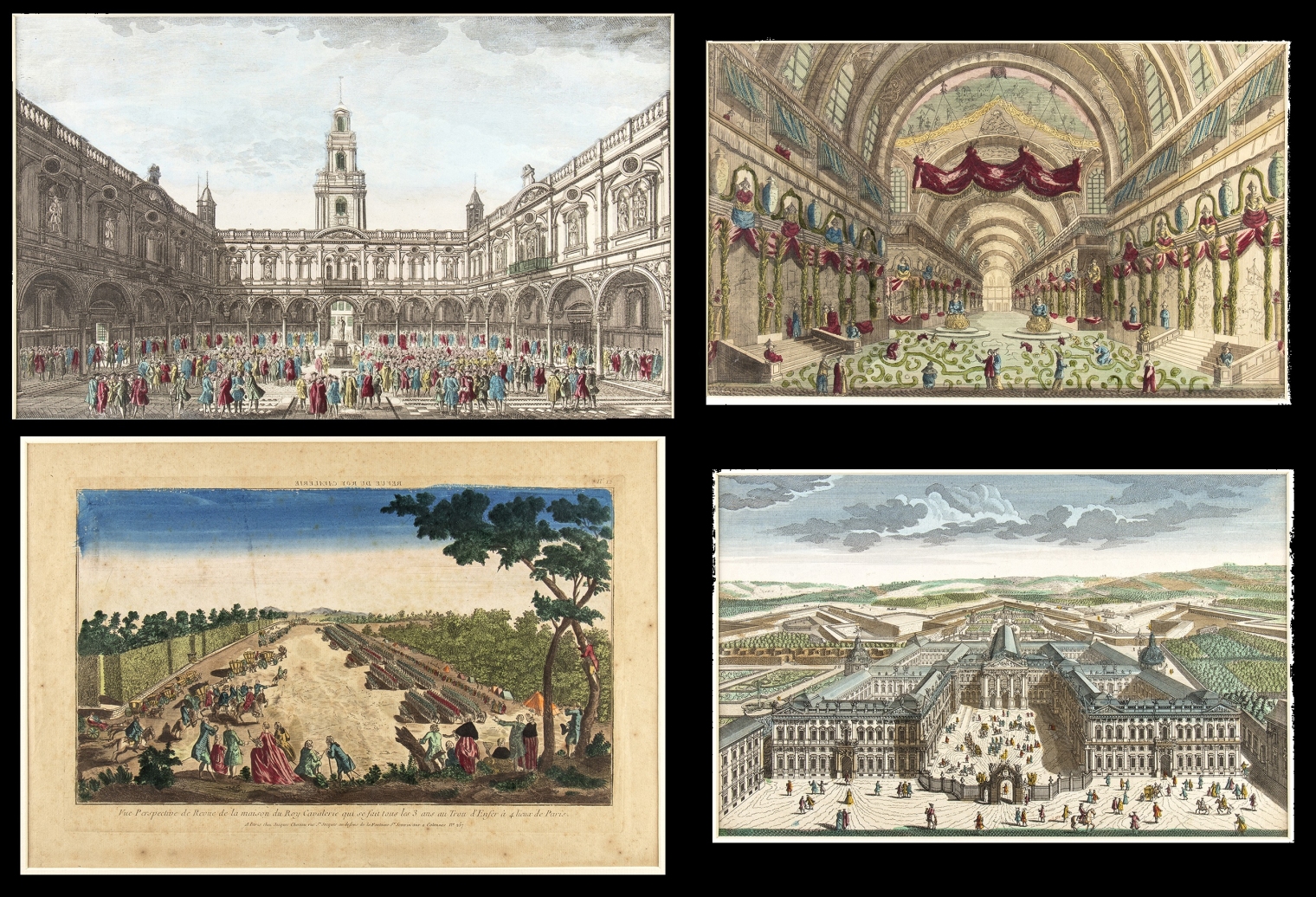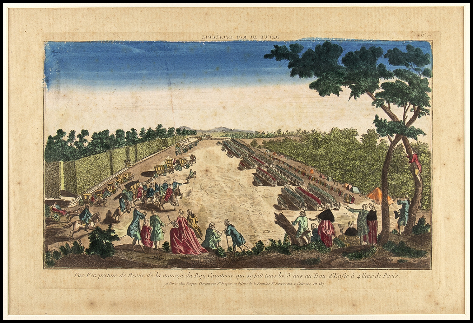 2) Vue perspective de revue de la maison du Roy Cavalerie qui se fait tous les 3 ans au Trou d'Enfer à 4 lieux de Paris. Acquaforte, 32,9 x 47,8 cm. Veduta ottica raffigurante la sfilata della cavalleria reale che si svolgeva ogni tre anni a Parigi. Pubblicata a Parigi da Jacques Chereau. Esemplare con bella coloritura coeva, incollato tra due cartoncini di passepartout moderno. Grandi margini originali preservati. Buono stato di conservazione salvo qualche segno di fioritura.