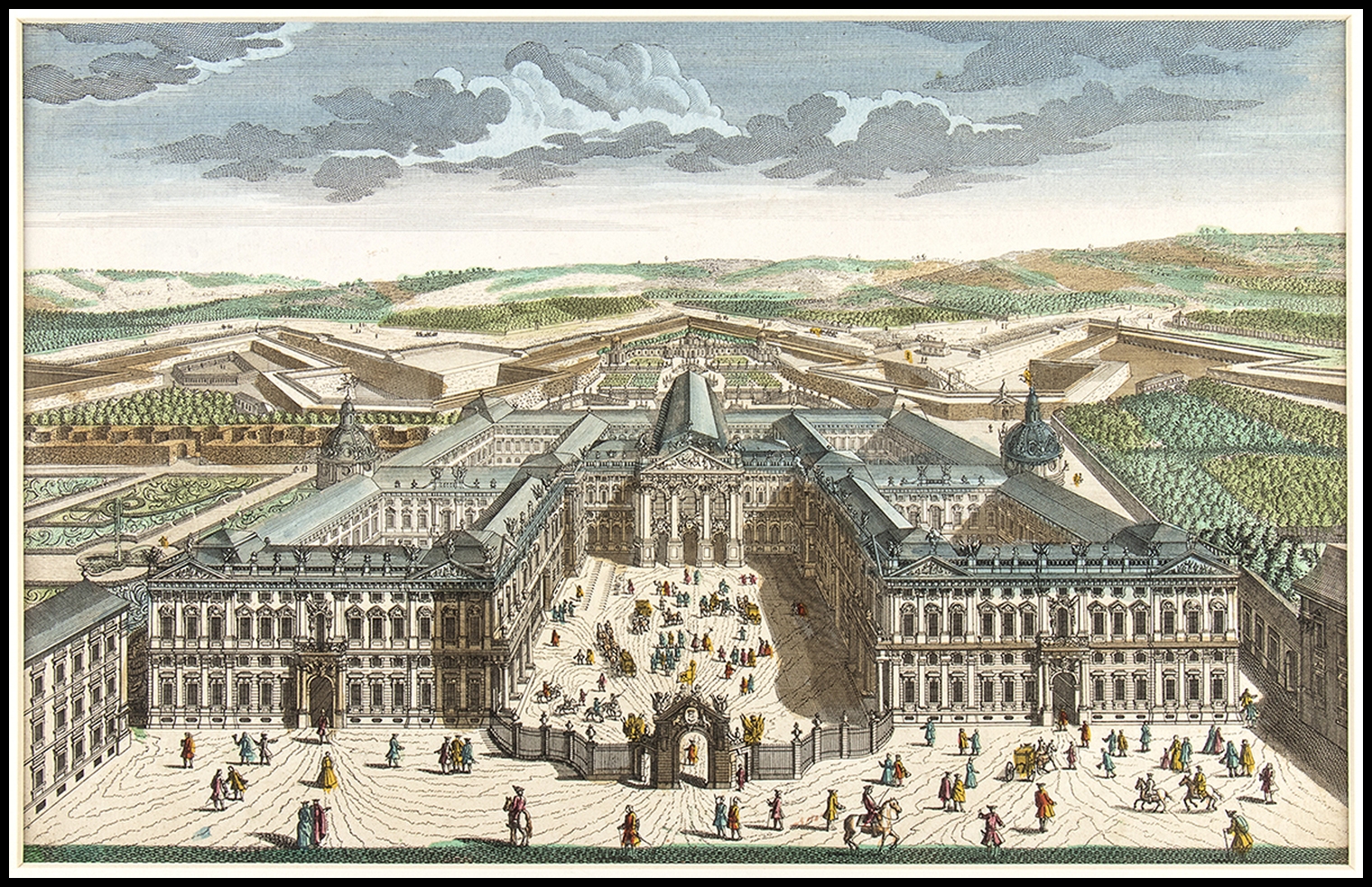 1) Vue du nouveau Palais de Mgr l’évêque et Prince de Wutzbourg dans le cercle de Franconie. Acquaforte, 26,2 x 41 cm. Veduta ottica del XVIII secolo raffigurante il palazzo di Wutzburg. Pubblicata a Parigi da J. Chéreau a rue Saint Jacques. Esemplare con bella coloritura coeva, rifilato e incollato tra due cartoncini di passepartout moderno. Altrimenti in buono stato.