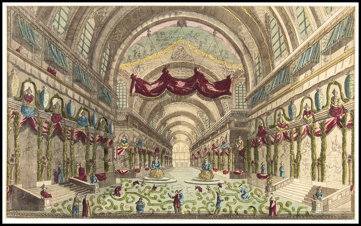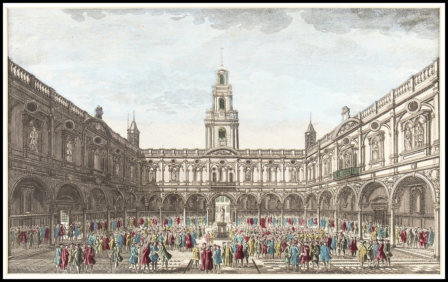 3) Vue intérieure de la Bourse royale à Londres. Acquaforte, 25,4 x 41,2 cm. Veduta ottica raffigurante il secondo Royal Exchange a Londra. Esemplare con bella coloritura coeva, rifilato e incollato tra due cartoncini di passepartout moderno. Altrimenti in buono stato.