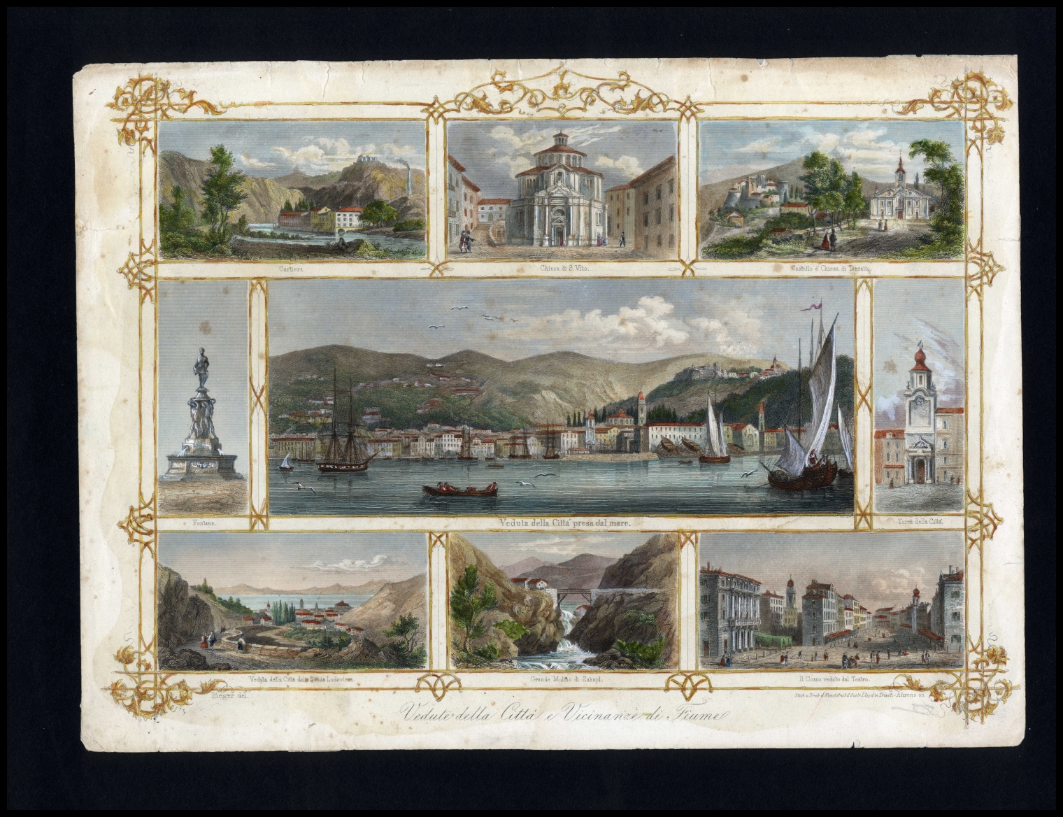 Gradevole incisione con 9 piccole vedute della città: Cartiera, Chiesa di S. Vito, Castello e chiesa di Tersalto, Fontana, Veduta della citta' dal mare, Torre della citta', Veduta della citta' dalla Strada Lodovicca, Grande Moli. Stampata a Trieste, 1850 ca.
