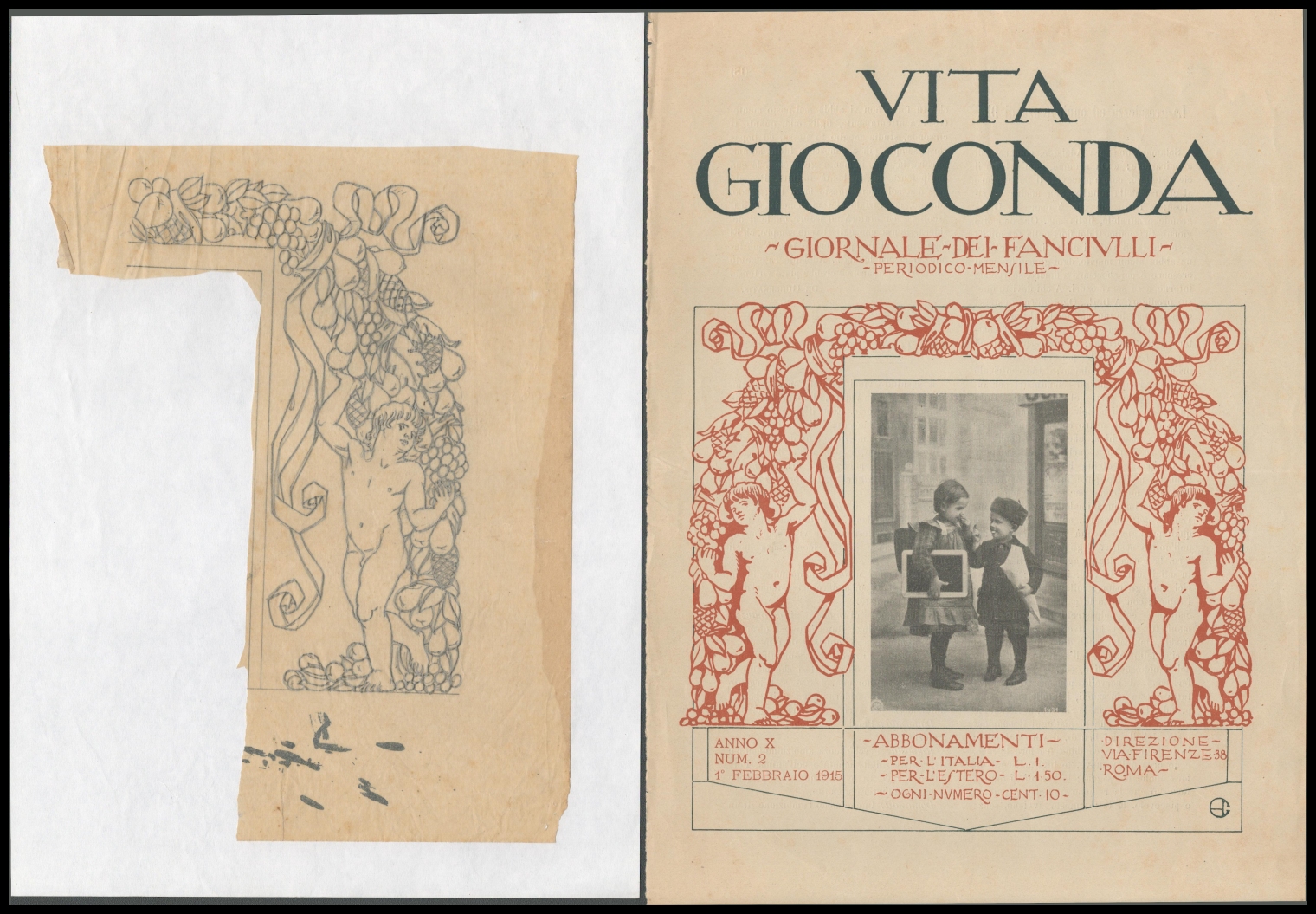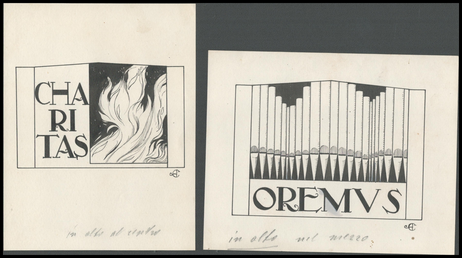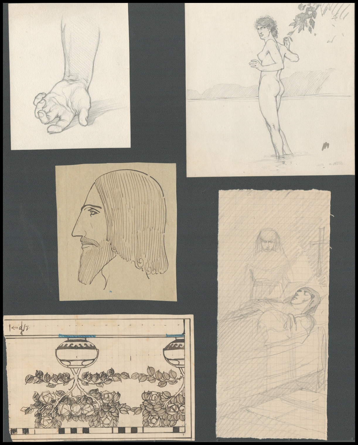 Interessante raccolta di disegni, di cui alcuni eseguiti fronte/retro. Comprende oltre ad altri anche disegni preparatori in stile Art Nouveau e disegni eseguiti su carta lucida, due accompagnati dalle pagine stampate per le quali erano i progetti. Alcuni firmati AC o firmati Arnaldo Carnevali, altri con note manoscritte.