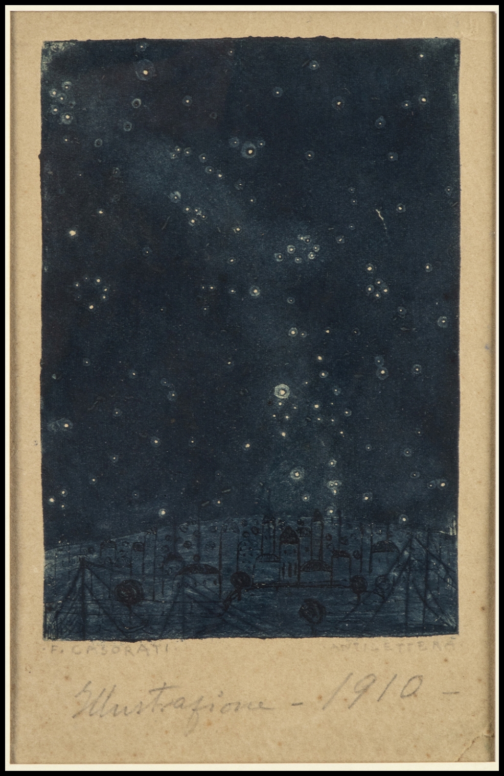 1) La notte, 1910, acquaforte e acquatinta, 18,5 x 12,9 cm (lastra), bella prova firmata, intitolata e datata a matita. Buone condizioni, con passepartout e cornice (62 x 44 x 3,5 cm). Al retro l’etichetta della mostra "Omaggio a Felice Casorati", Arona, 2003.