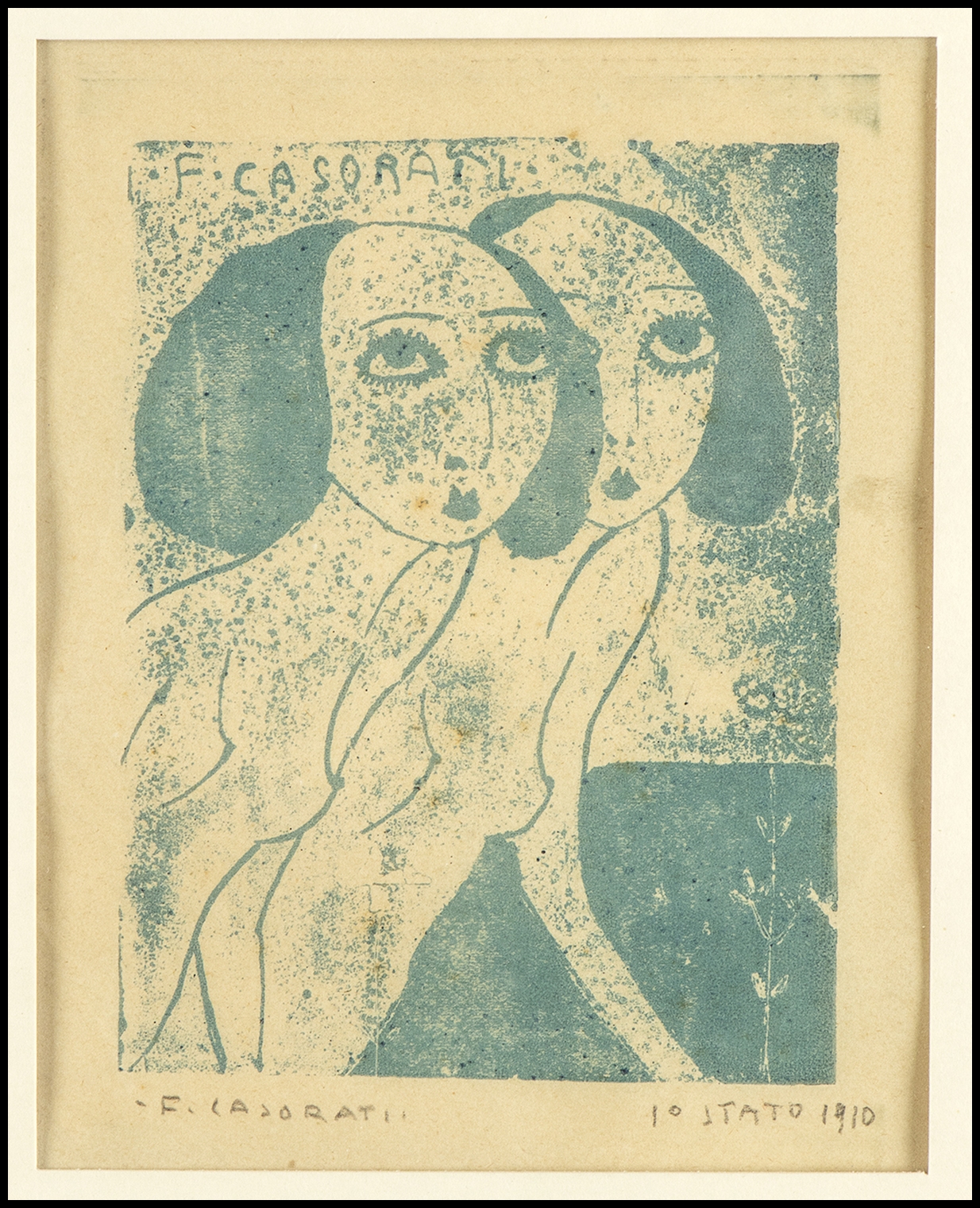 2) Due fanciulle con il fiore, 1910, litografia ad inchiostro celeste, 12,5 x 10 cm (lastra); I stato, datata e firmata a matita. Buone condizioni, con passepartout e cornice (62 x 44 x 3,5 cm). Al retro l’etichetta della mostra "Omaggio a Felice Casorati", Arona, 2003.