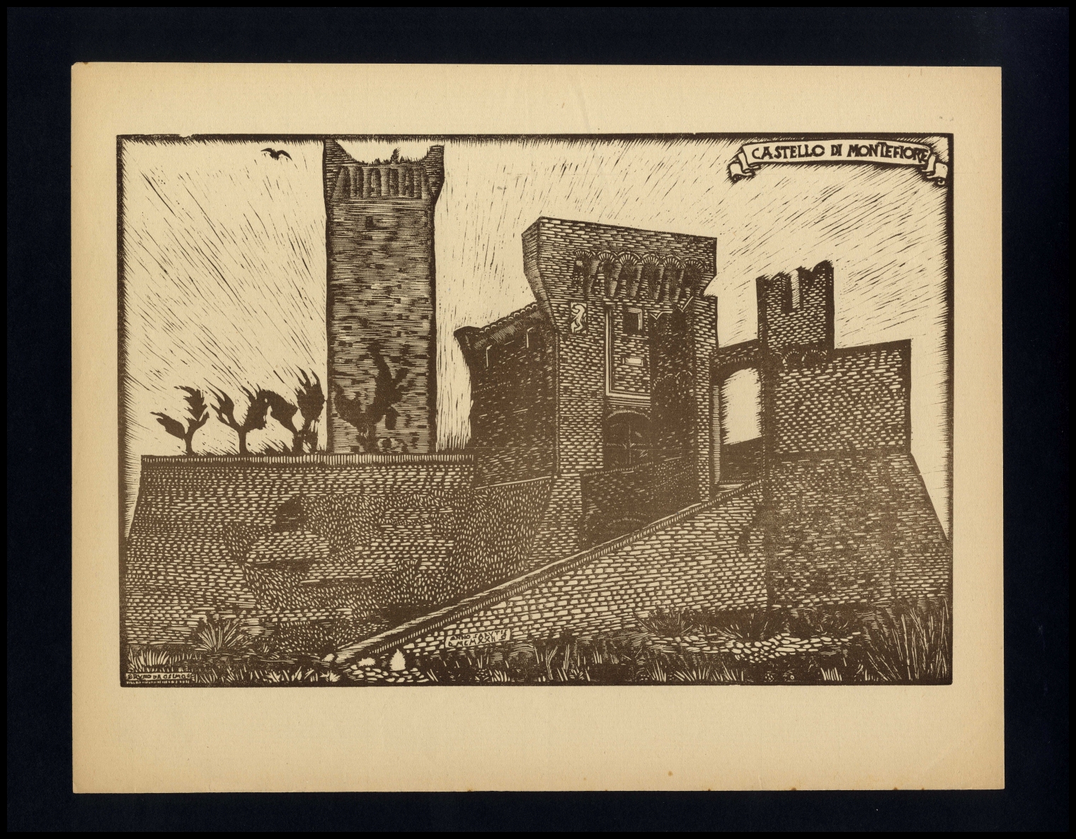 Suggestiva veduta del Castello che si trova lungo la strada che da Osimo conduce a Montefano. Xilografia originala tratta dalla pubblicazione mensile "Xilografia", edita e diretta da Francesco Nonni e stampata a Faenza dallo STABILIMENTO GRAFICO F. LEGA, 1924-1926.