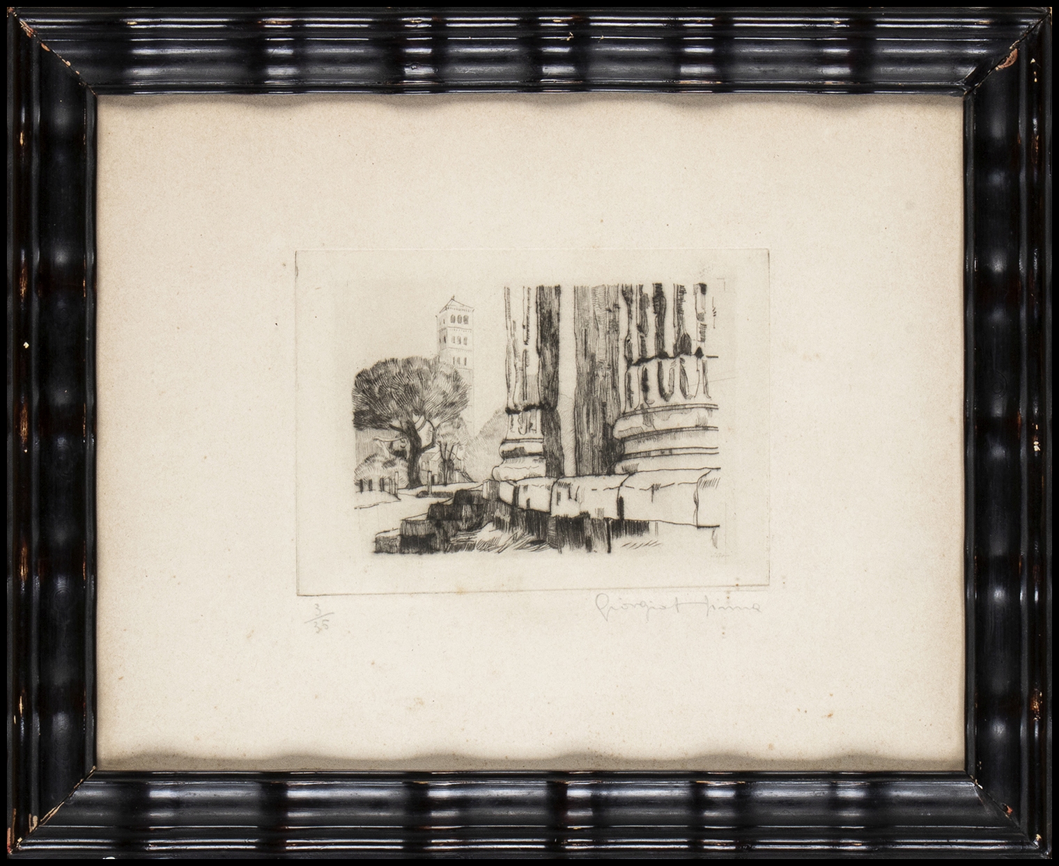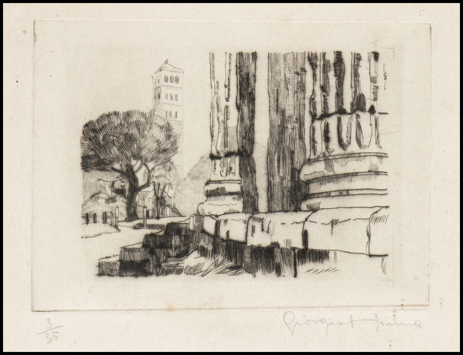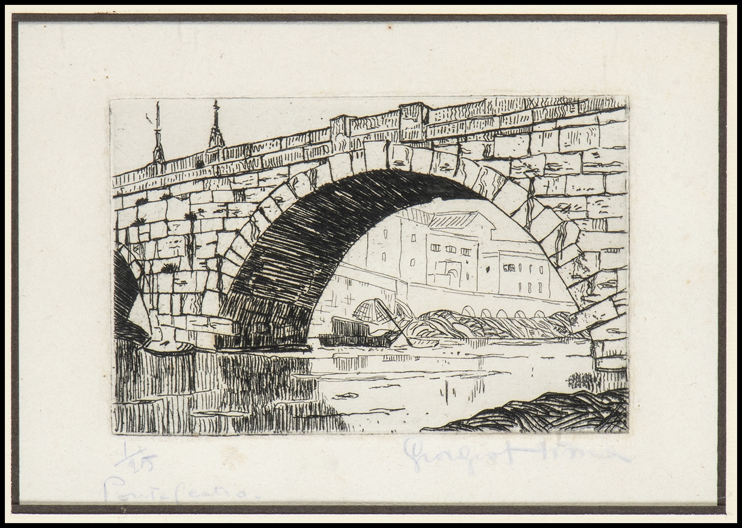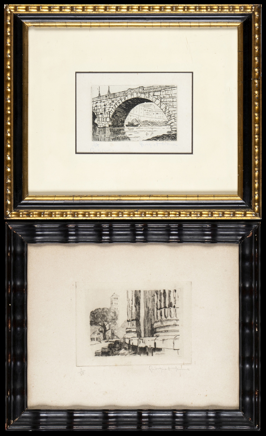 1) "Ponte Cestio a Roma", tiratura 1/25, firmata e titolata a matita. 2) "S. Maria in Cosmedin vista da dal Tempio di Ercole Vincitore", tiratura 3/35, firmata a matita.