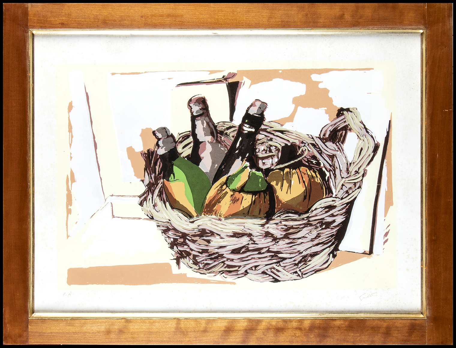 Renato Guttuso (1912-1987): NATURA MORTA CON CESTO DI BOTTIGLIE