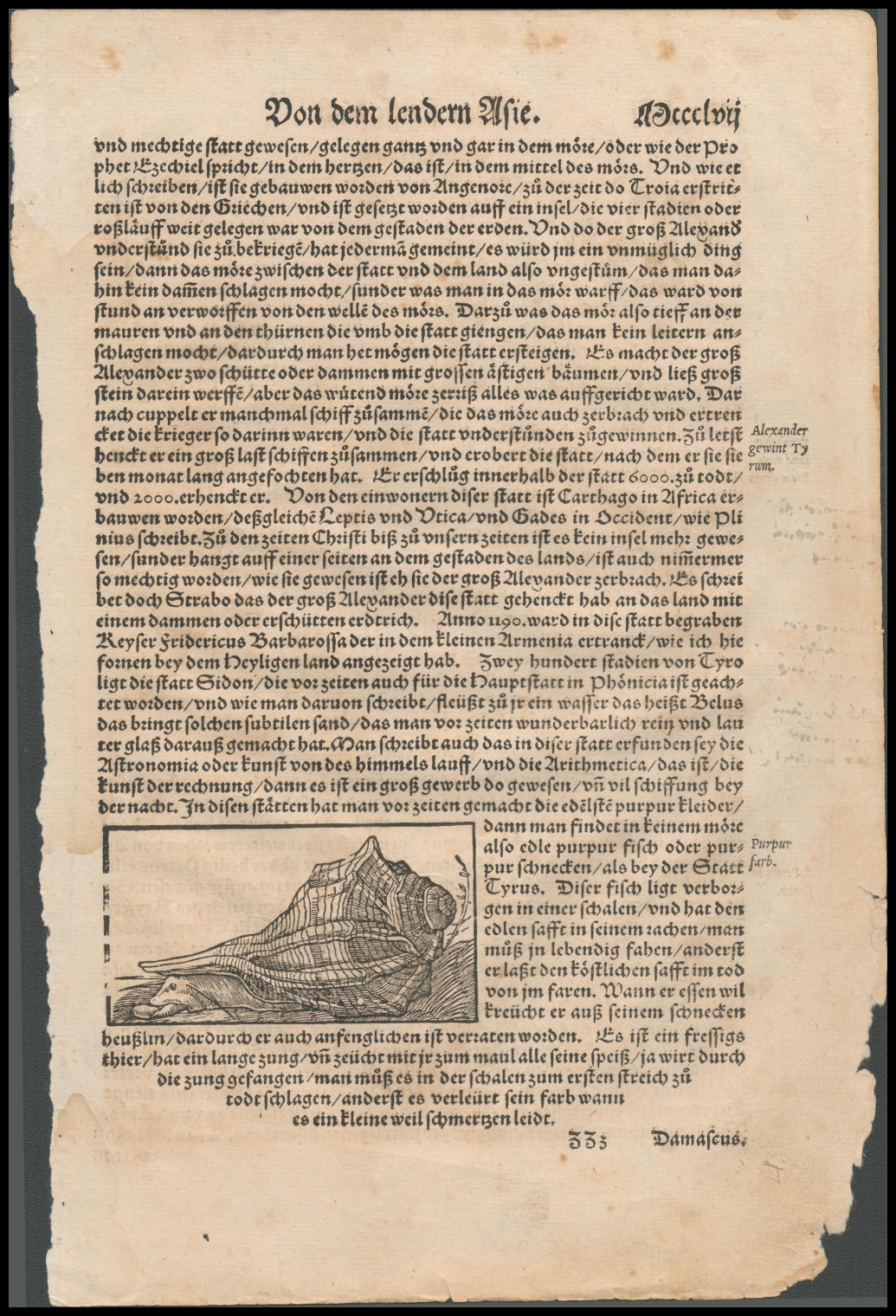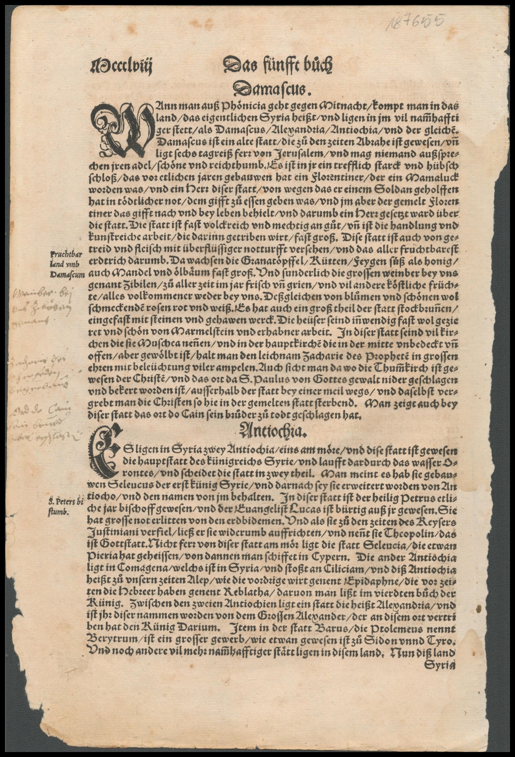 Foglio tratto da Cosmographia universalis,edizione della seconda metà di XVI secolo. Con descrizione di Damascus e Antiochia.