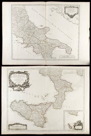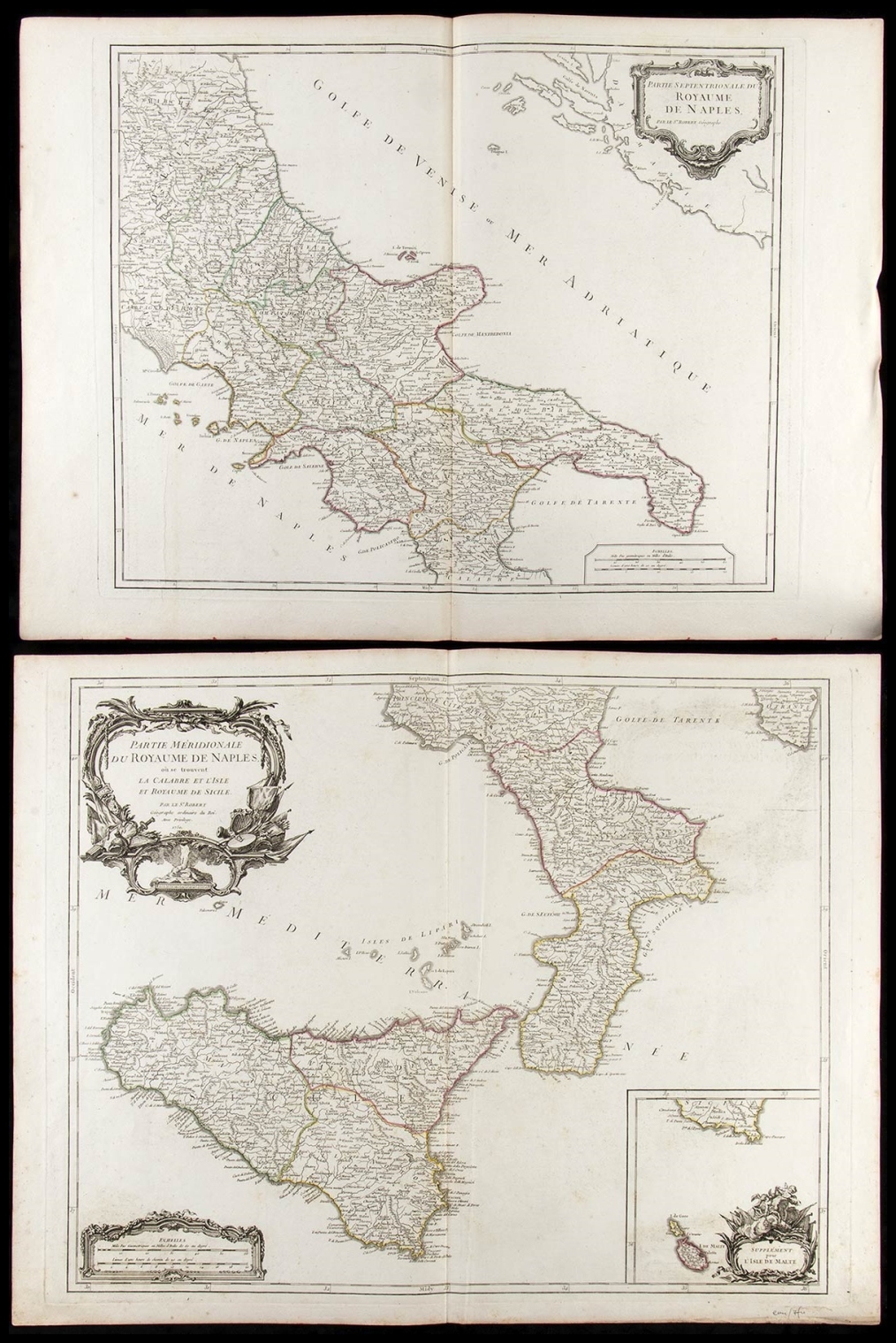 Gilles Robert de Vaugondy (1688-1766): PARTIE SEPTENTRIONALE DU ROYAUME DE NAPLES / PARTIE MERIDIONALE DU ROYAUME DE NAPLES OÙ SE TROUVENT LA CALABRE ET L'ISLE ET ROYAUME DE SICILE