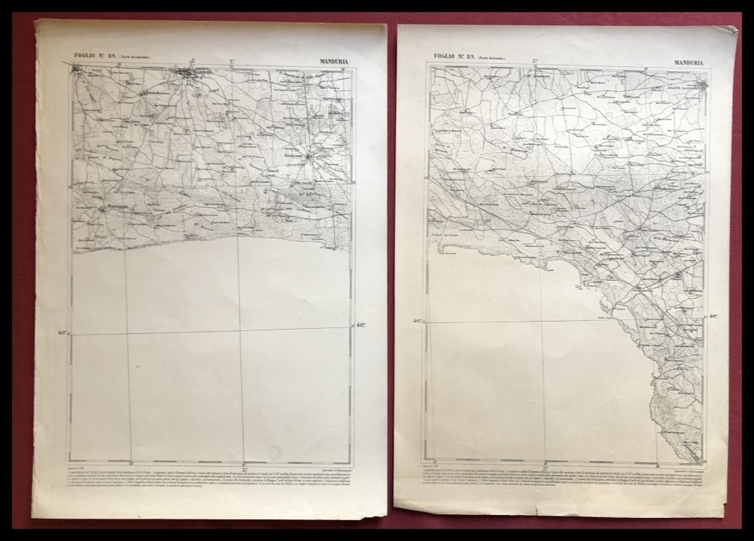 Su due fogli. Carta non vergata, con timbro a secco di Istituto Topografico Militare. Buone condizioni salvo lievi segni di uso sui margini.