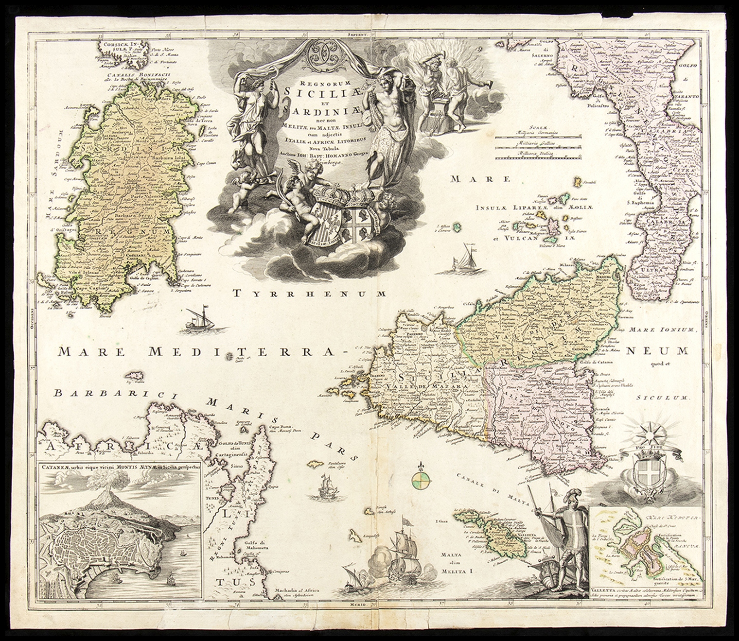 Johann Baptist Homann (1664-1724): REGNORUM SICILIAE ET SARDINIAE NEC NON MELITAE SEU MALTAE INSULA CUM ADJECTIS ITALIAE ET AFRICAE LITORIBUS NOVA TABULA