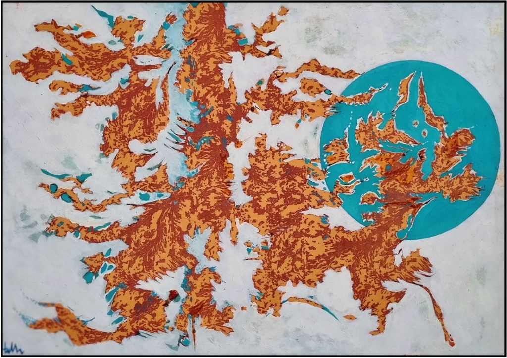 TULLI WLADIMIRO Macerata 1922 - 2003 "Con quella luna verde" Acrilici e collage applicato su tavola, cm 70x50, del 1965. Opera firmata sul fronte in basso a sinistra. Al retro titolo, data, firma ed etichetta della Galleria d'arte Stendhal. Esposta nella mostra personale dell'artista, in Reggio Calabria.
