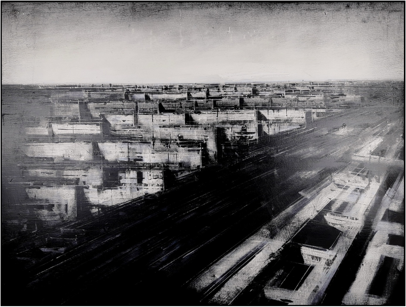 GUAITAMACCHI JONATHAN Londra 1961 "Ovest" Olio su carta intelata cm 80x60 del 2004. Sul retro è firmato, intitolato e datato, etichetta di provenienza della Galleria Real Arte di Sant'Elpidio. FM ed autentica su fotografia.