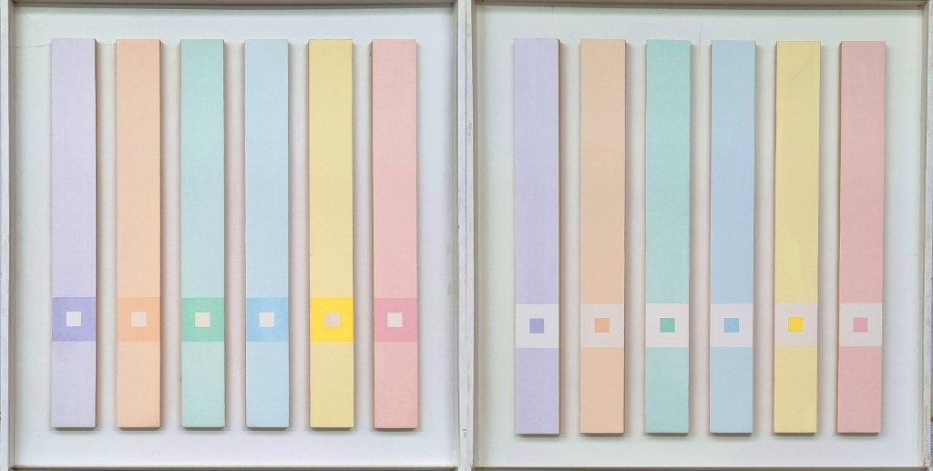 CALDERARA ANTONIO Abbiategrasso (MI) 1903 - Vacciago (NO) 1978 "Variazioni cromatiche positivo-negative" Del 1971, serigrafia su elementi in legno sagomati e assemblati, cm 2x9x81 l'uno, applicati su due tavole cm 100x100 l'una, totali cm 200x100. Tiratura di 50 esemplari. Sul retro etichetta descrittiva a cura di "Edizioni Amatullo" Brescia.