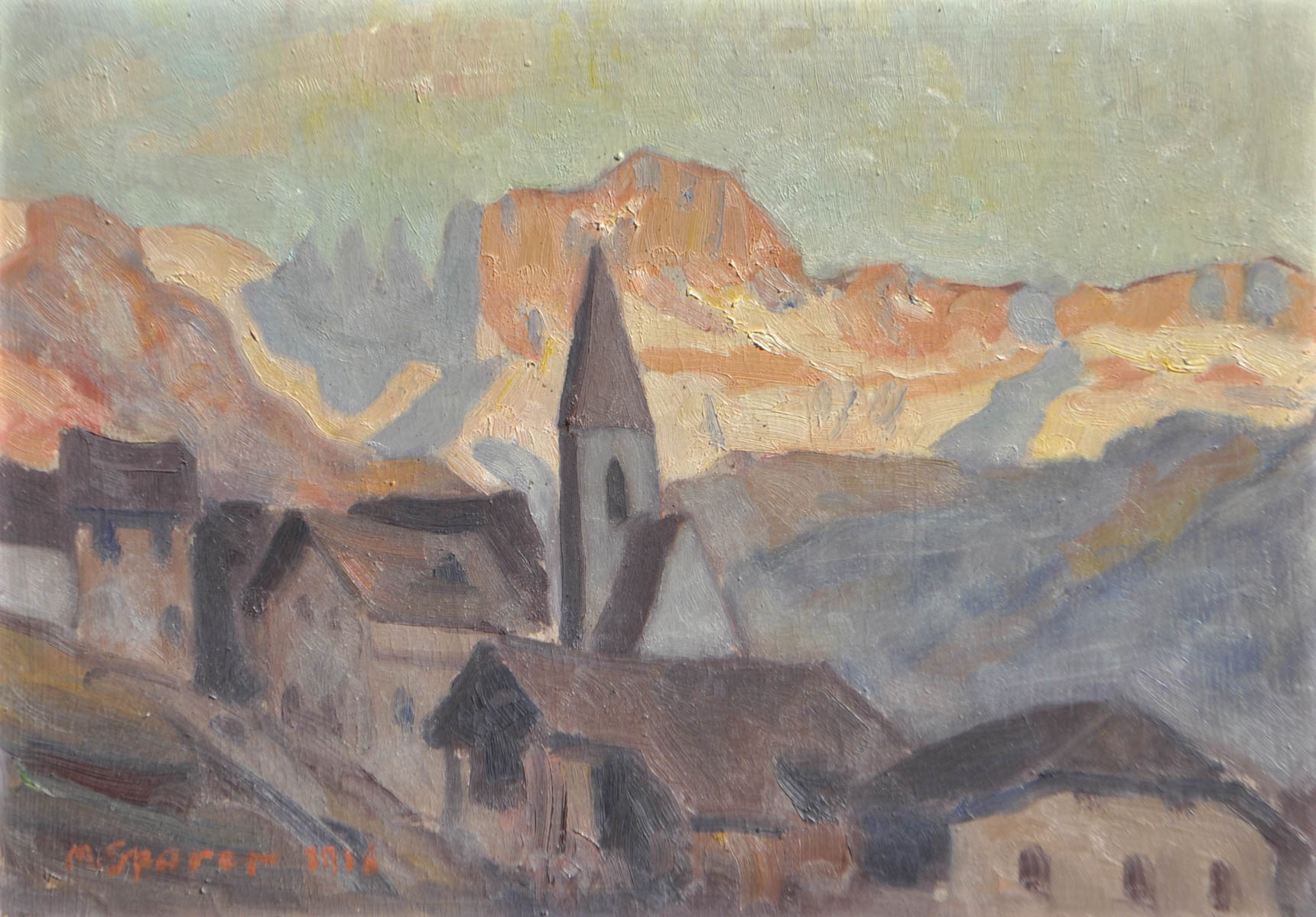 Max Sparer (Söll, Tramin/Termeno 1886 - Bozen/Bolzano 1968) Santa Maddalena con Catinaccio;Olio su cartone, 34 x 48,5 cm, in cornice