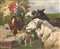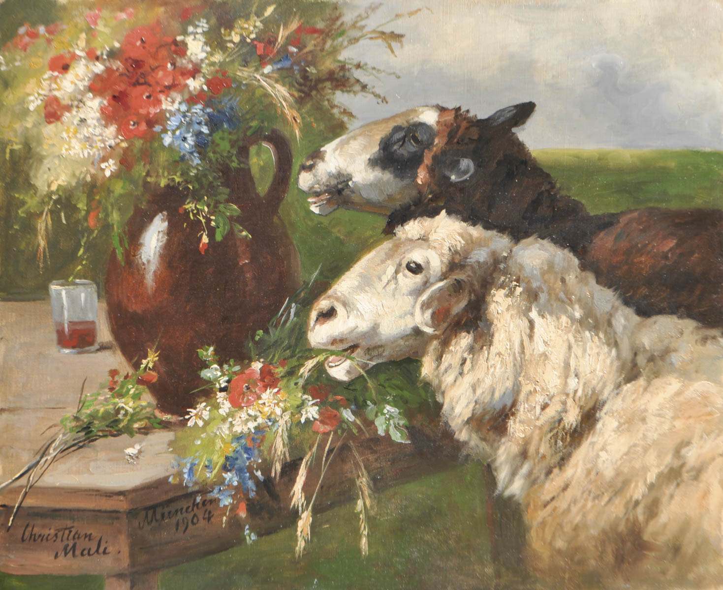Christian Mali (Broekhuizen/Utrecht 1832 - München/Monaco di Baviera 1906) Pecore sgraffignando un mazzo di fiori, 1904;Olio su tela, 46 x 56 cm, in cornice