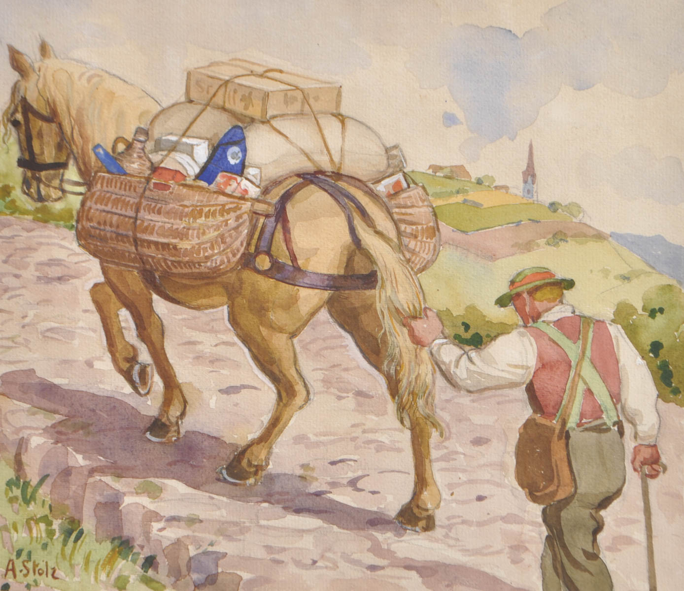 Albert Stolz (Bozen/Bolzano 1875 - 1947) Uomo della Val Sarentino con cavallo da soma;Acquerello, 24,2 x 28 cm, in cornice