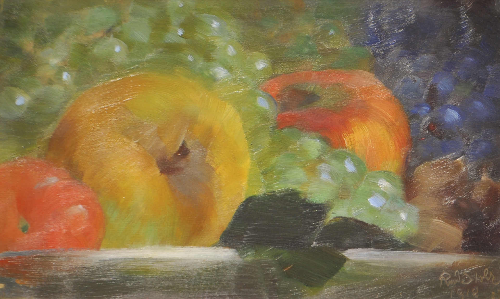 Rudolf Stolz (Bozen/Bolzano 1874 - Sexten/Sesto 1960) Natura morta con frutta, 1918;Olio su cartone, 19,5 x 32,5 cm, in cornice