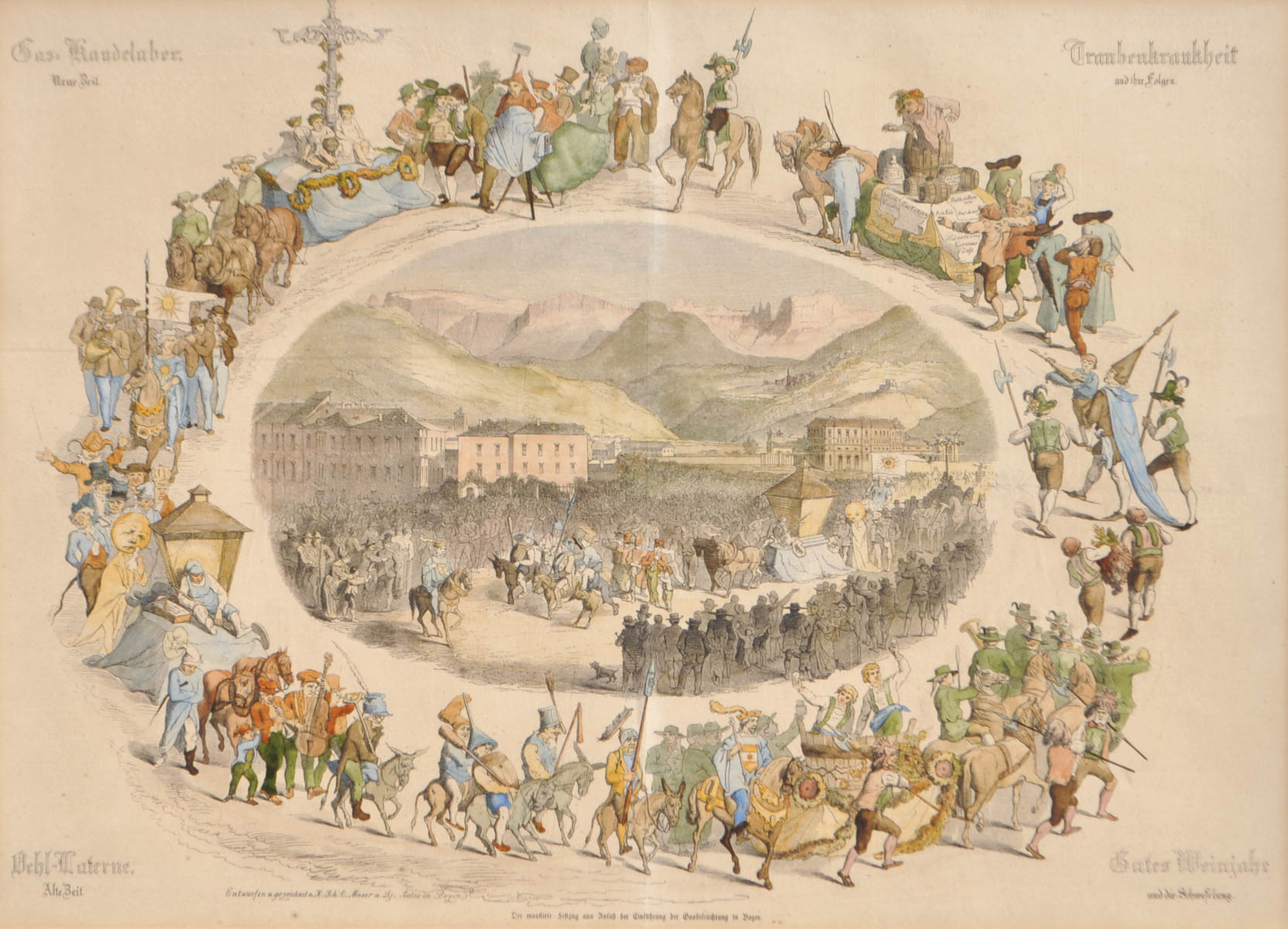 Heinrich von Schöpfer / Karl Moser d. Ä. / Ignaz Seelos Il corteo mascherato in occasione dell’introduzione dell’illuminazione a gas;a Bolzano il 10 novembre 1861