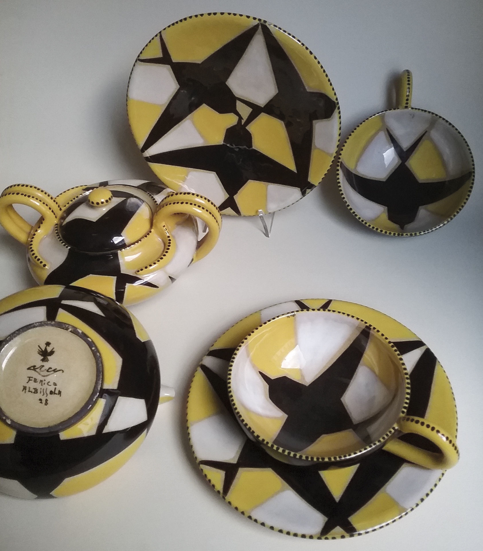 per la manifattura La Fenice di Albissola. Nome della manifattura, della località e 28 sotto la zuccheriera e lattiera; per i restanti simbolo della manifattura