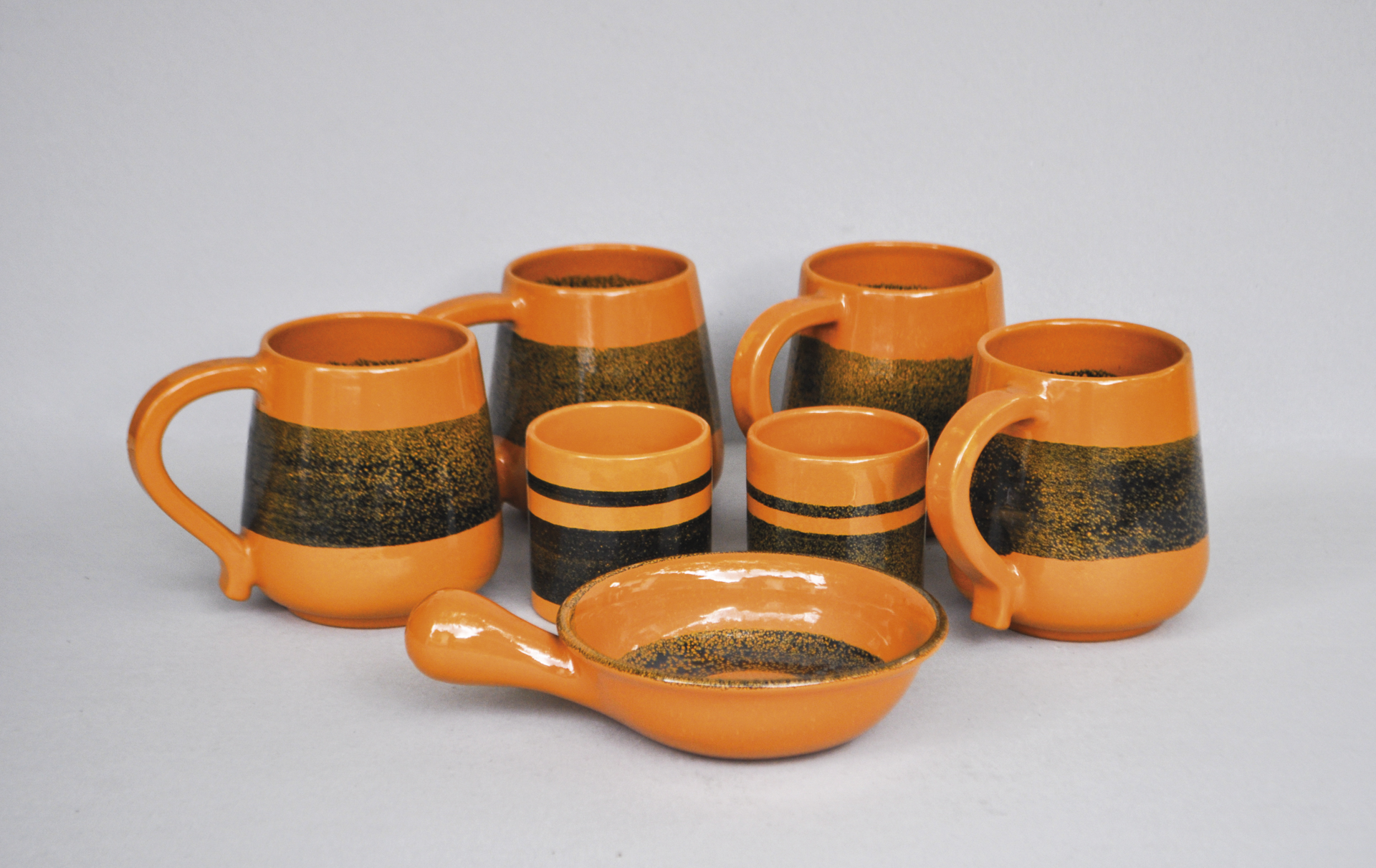 Pino Castagna Service für 8 Personen, 80er Jahre Servizio per otto persone, Anni '80;bicchieri,grandi e piccoli (h. 9/11 cm), piatti da antipasto, piani e fondi (diam. 20/21/26 cm), terrine (diam. 14 cm), 2 caraffe (h. 18 cm), 2 ciotole grandi (diam 21,5 cm) , in ceramica color arancione.